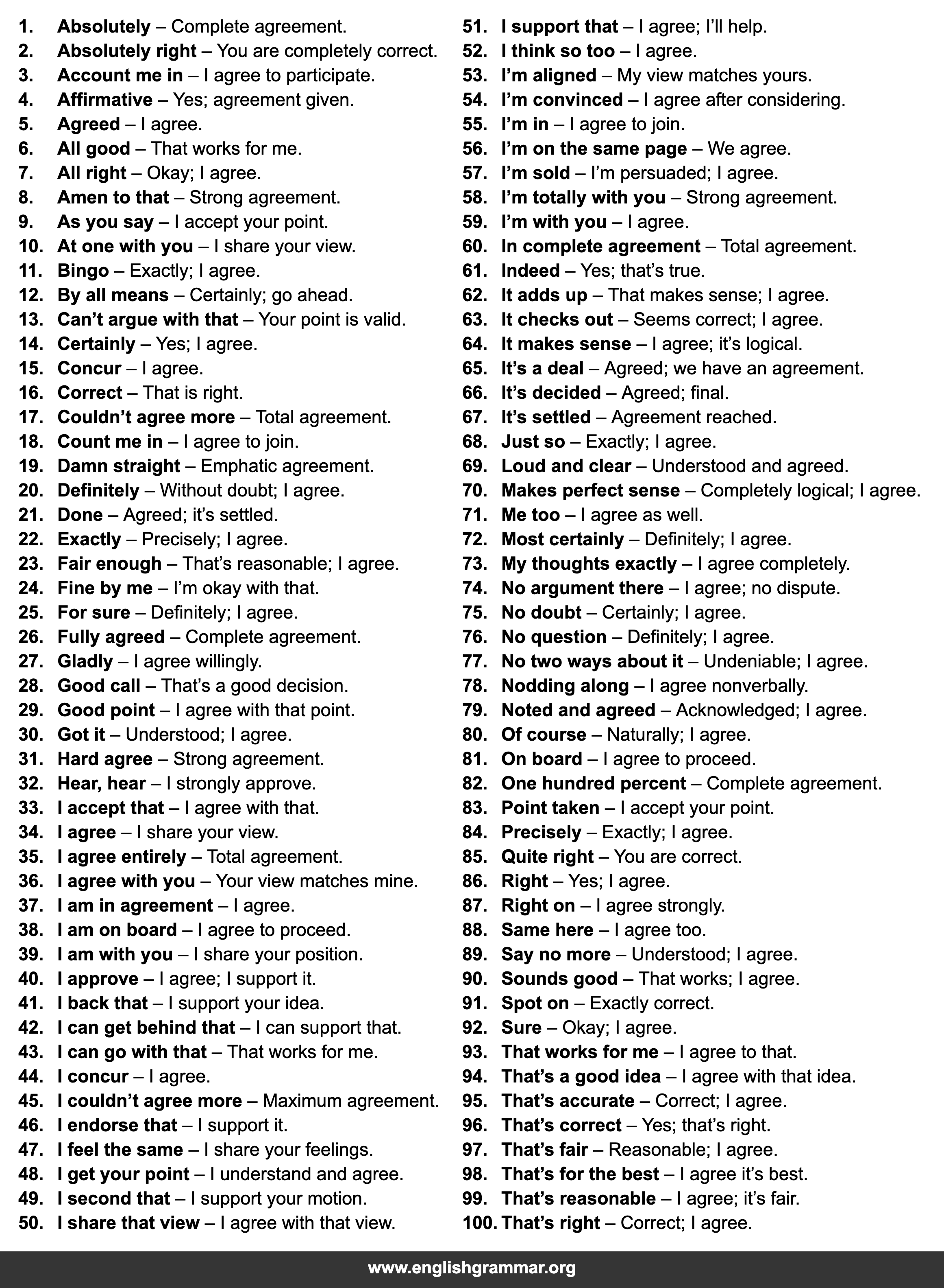 | 45. | I couldn’t agree more | Maximum agreement. |
