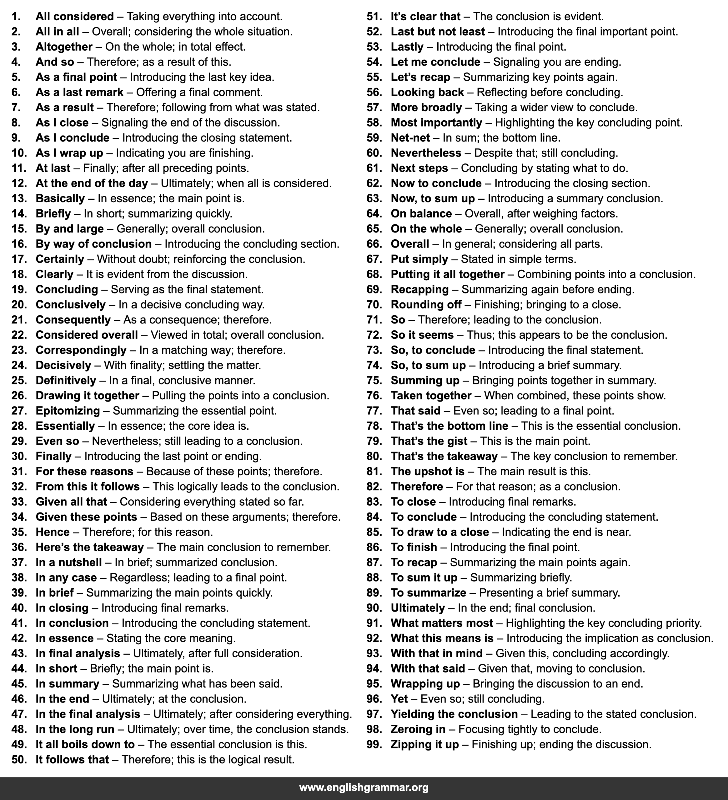 | 41. | In conclusion | Introducing the concluding statement. |