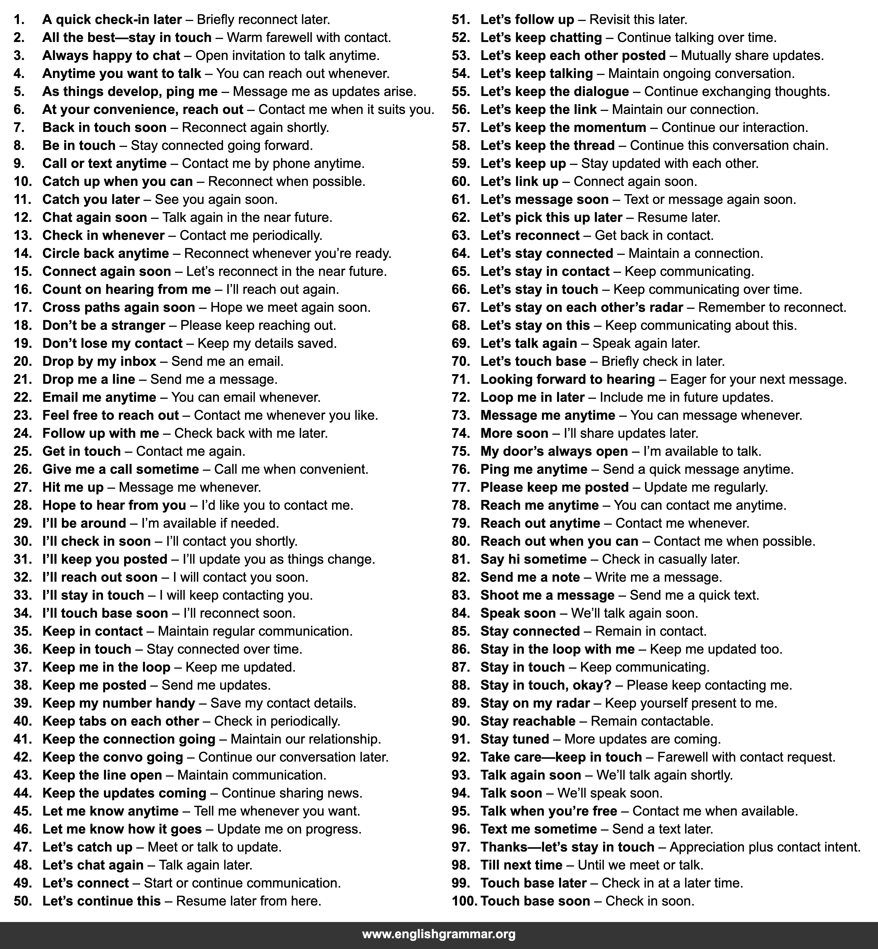 | 66. | Let’s stay in touch | Keep communicating over time. |
