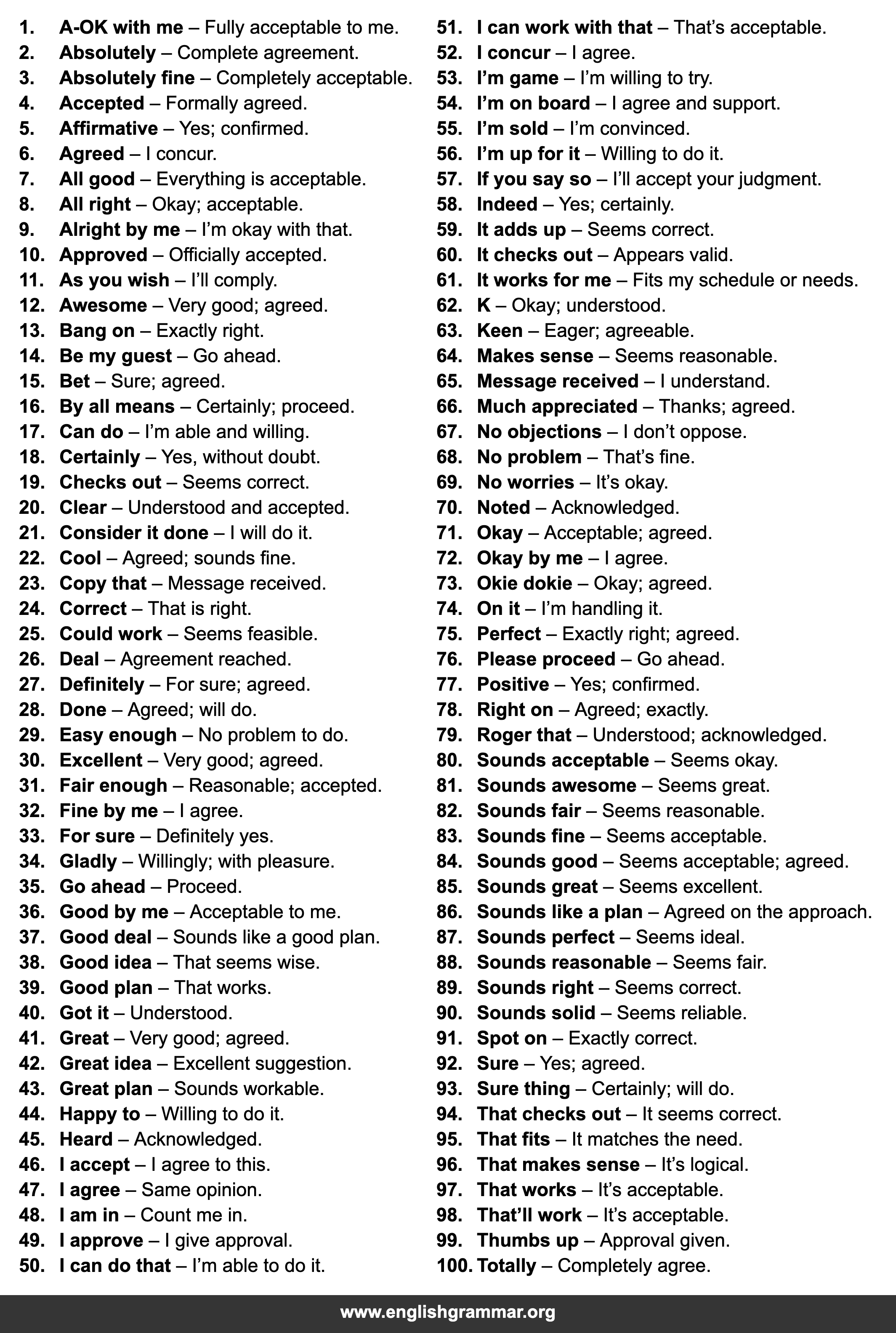 | 84. | Sounds good | Seems acceptable; agreed. |