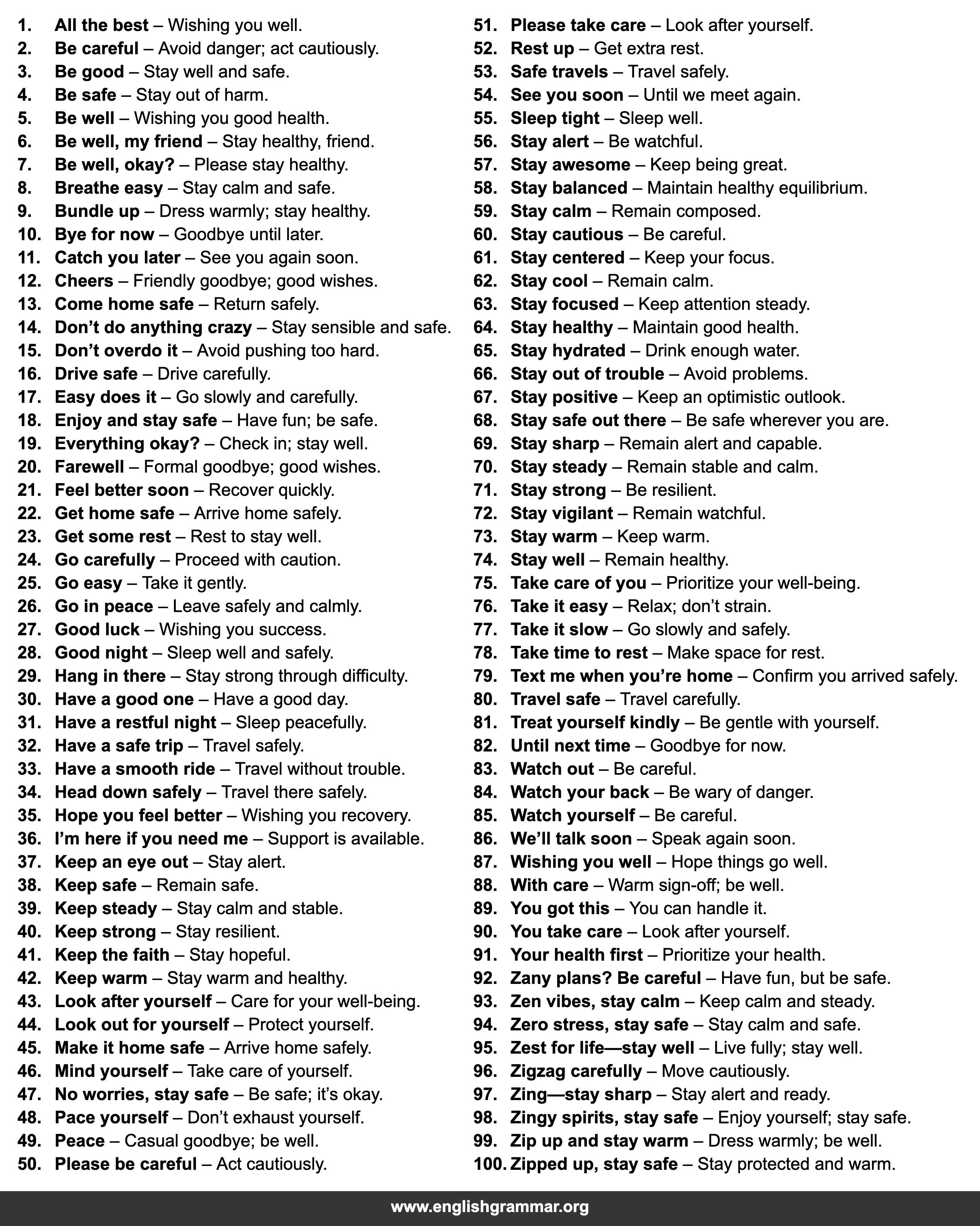 | 45. | Make it home safe | Arrive home safely. |