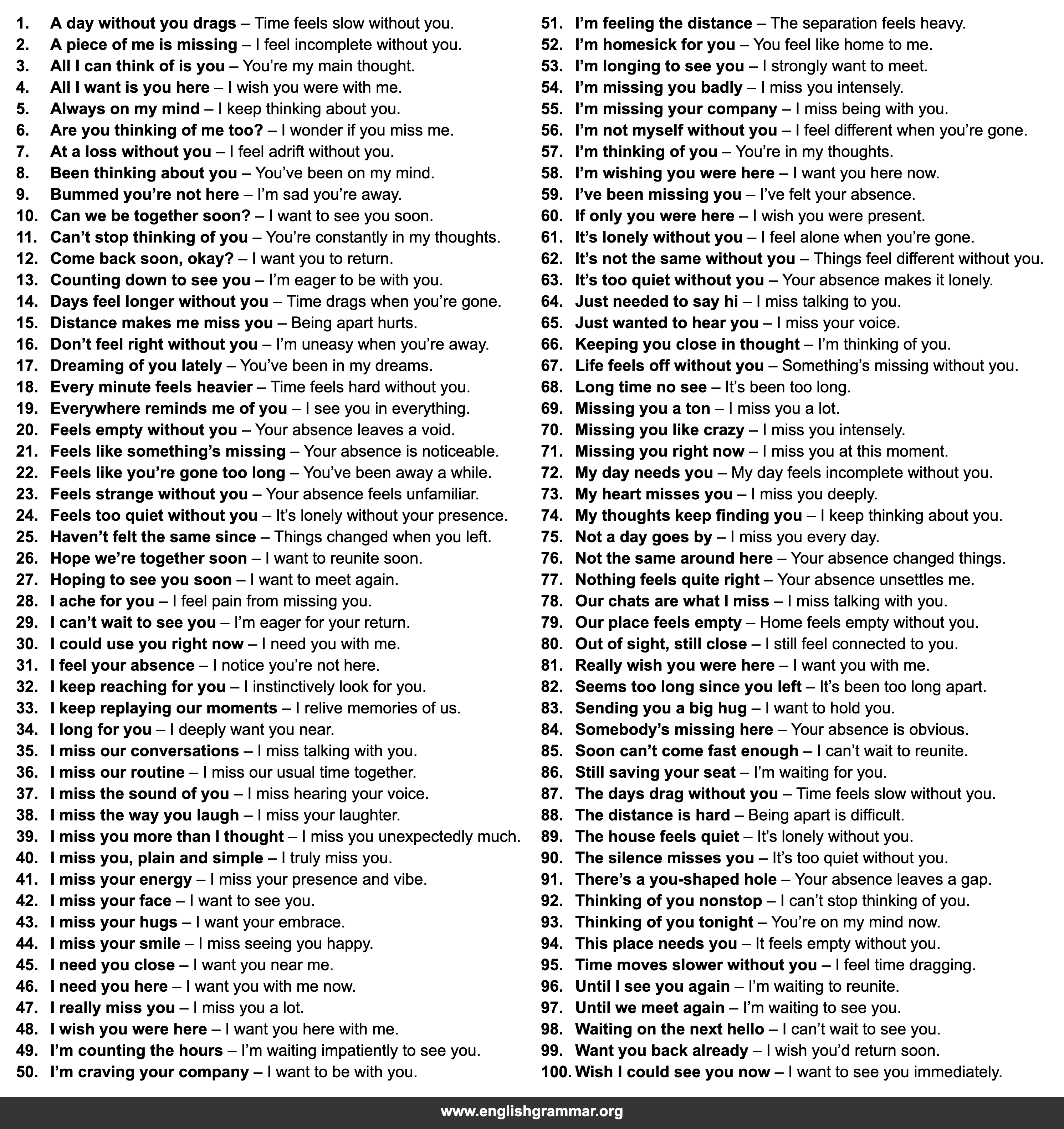 | 31. | I feel your absence | I notice you’re not here. |