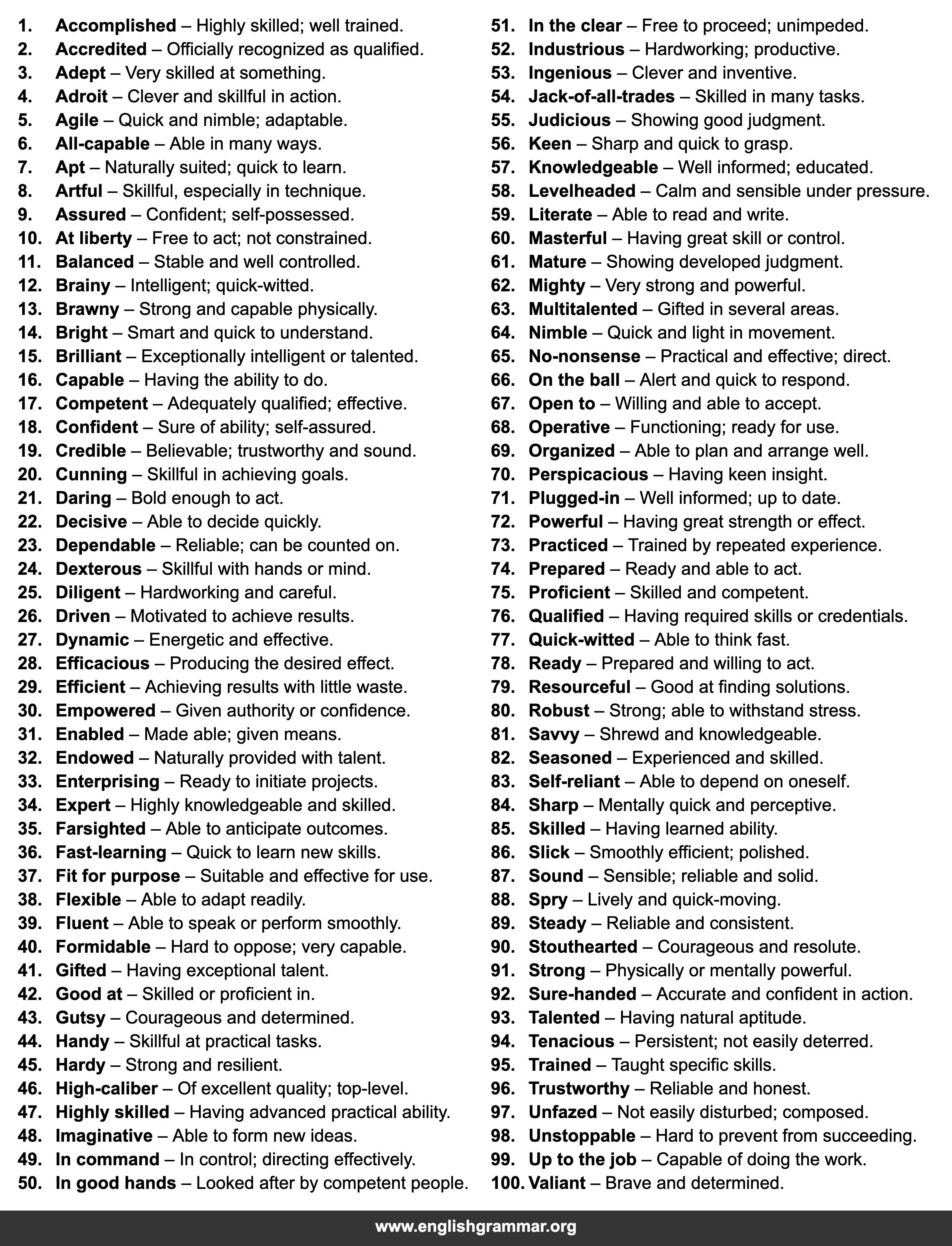 | 75. | Proficient | Skilled and competent. |