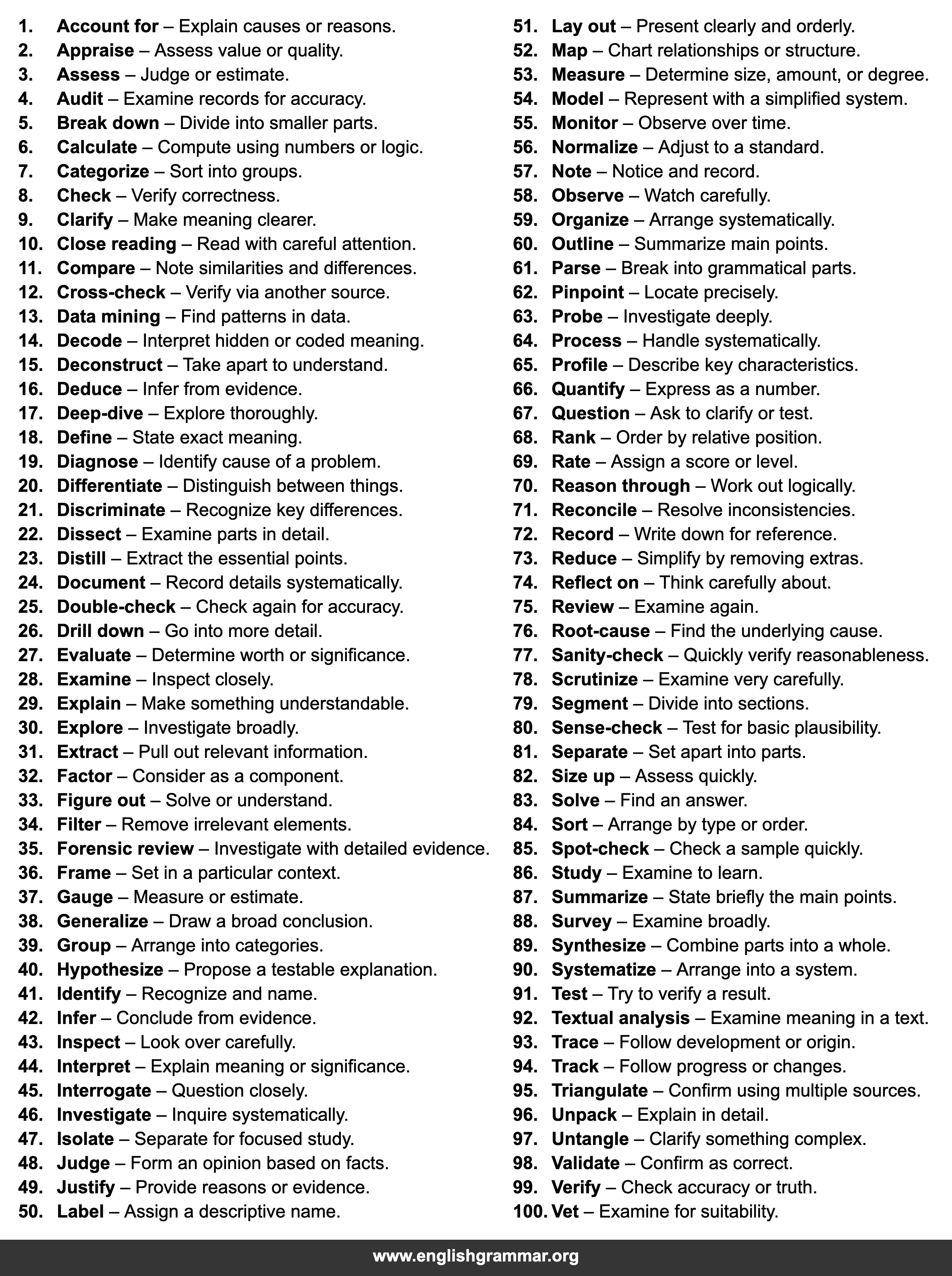 | 99. | Verify | Check accuracy or truth. |