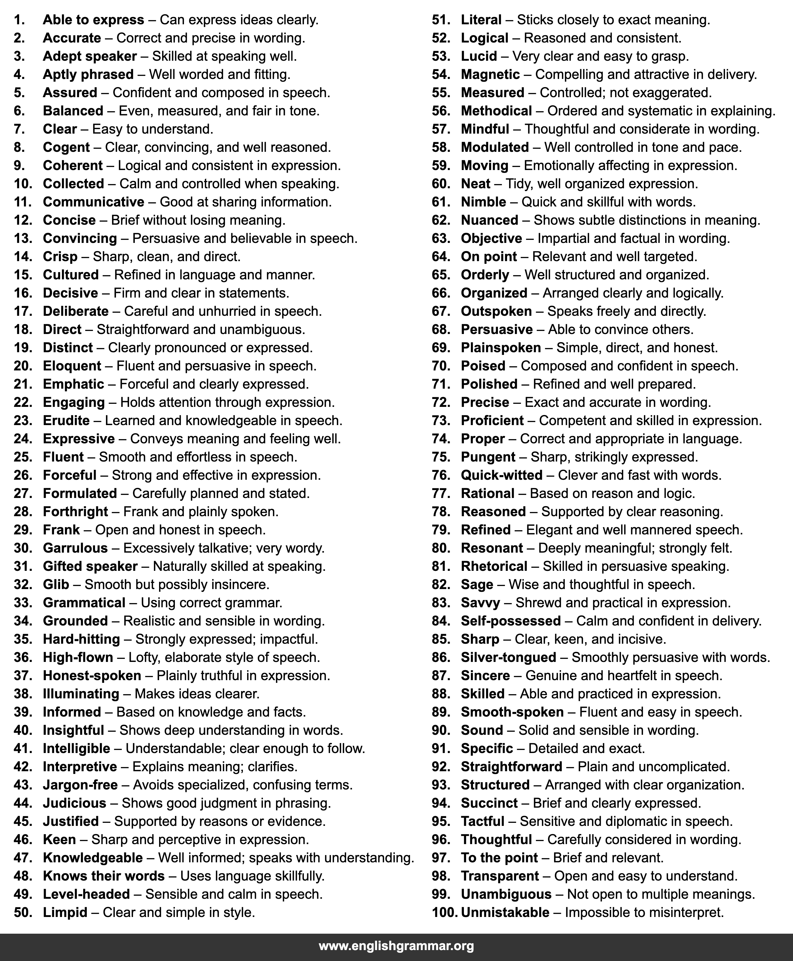 | 17. | Deliberate | Careful and unhurried in speech. |
