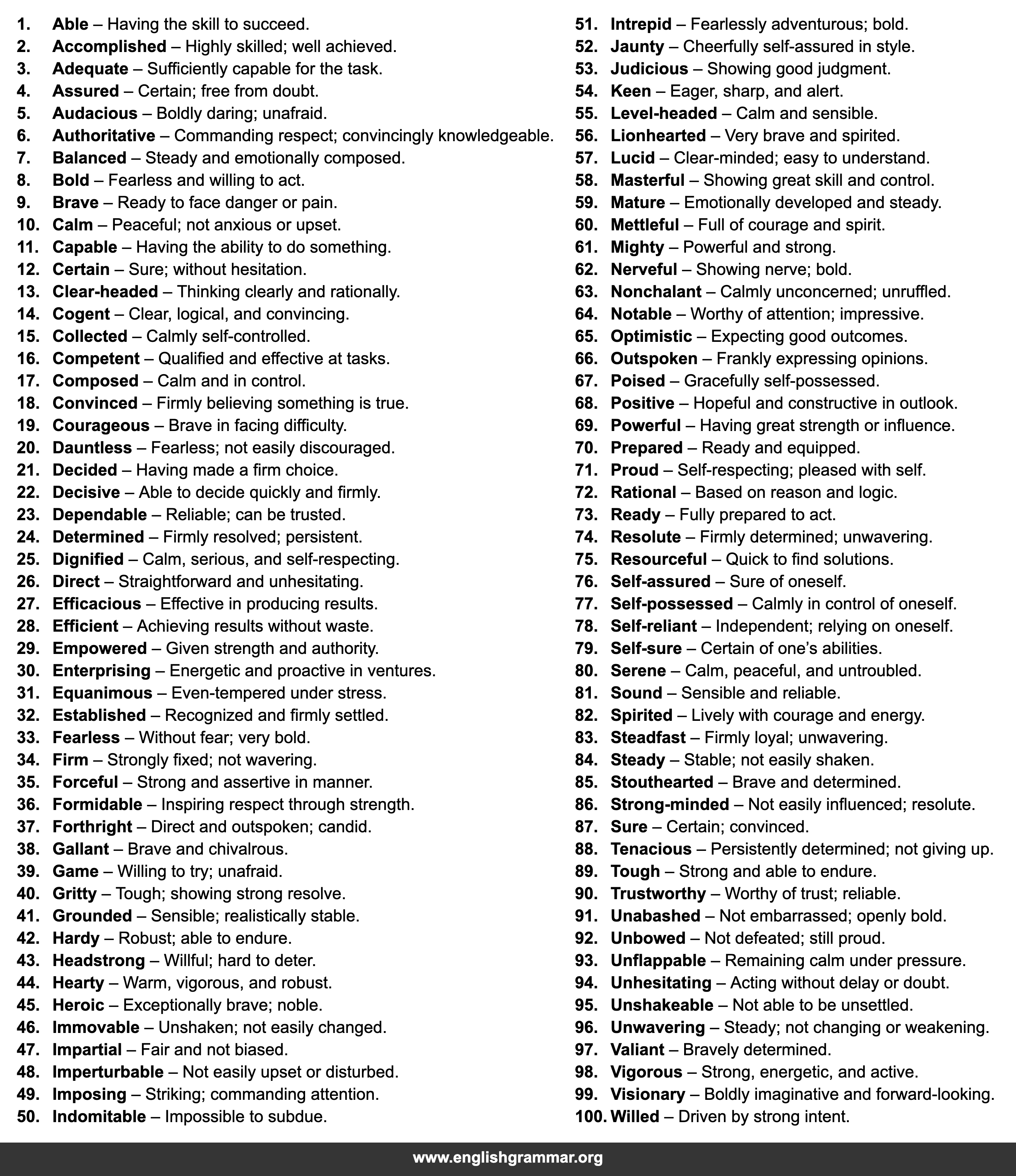 | 20. | Dauntless | Fearless; not easily discouraged. |