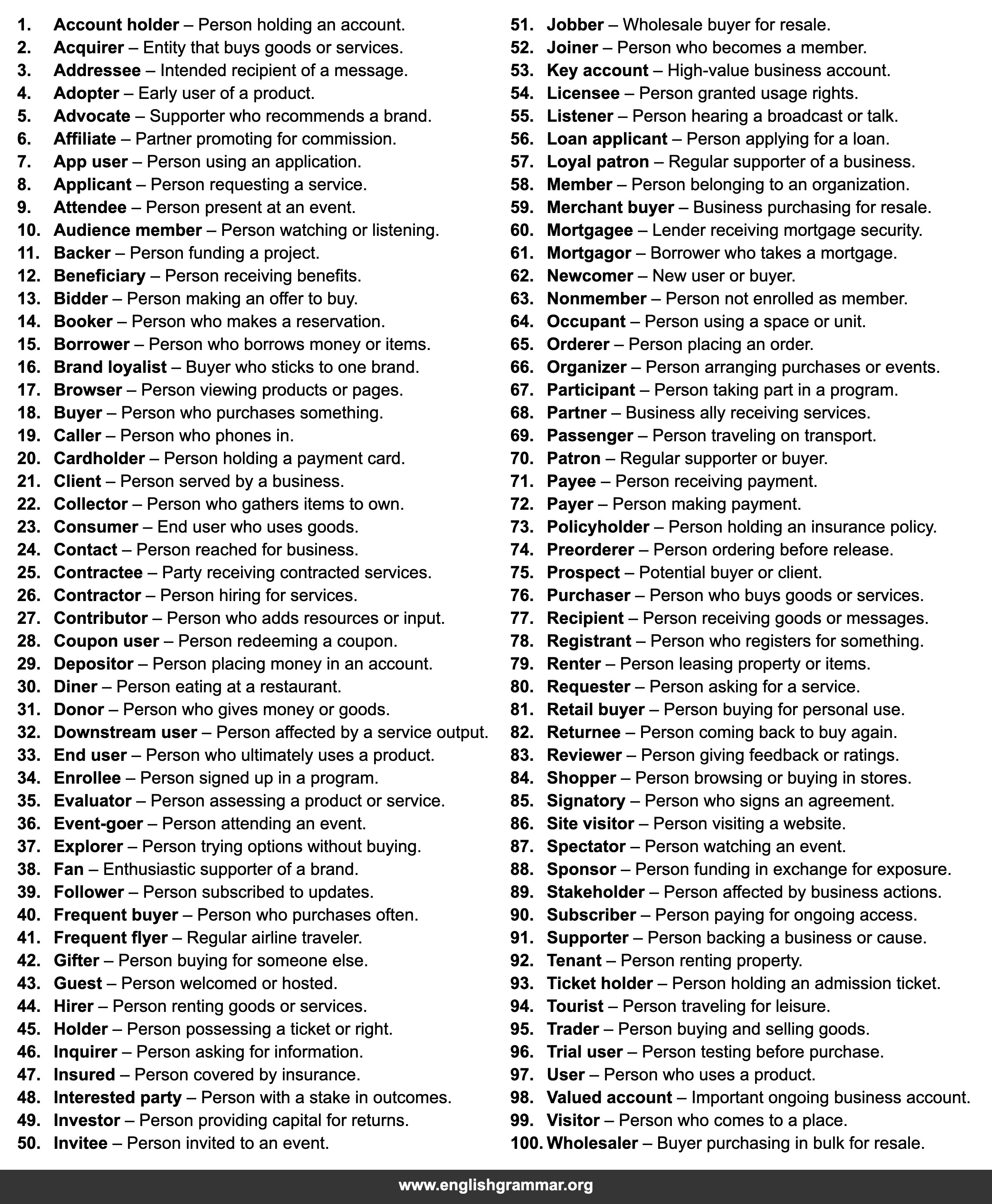 | 100. | Wholesaler | Buyer purchasing in bulk for resale. |