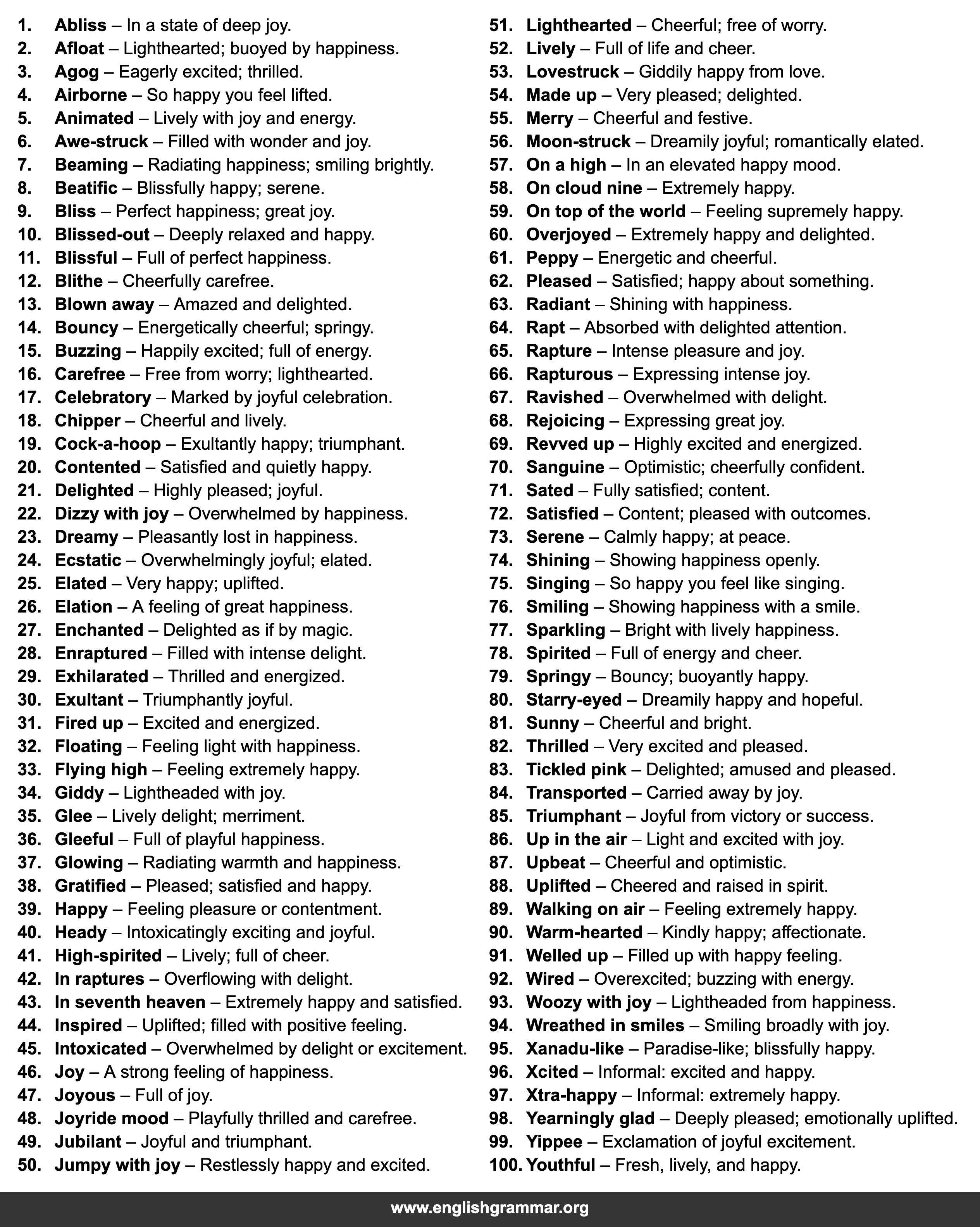 | 24. | Ecstatic | Overwhelmingly joyful; elated. |