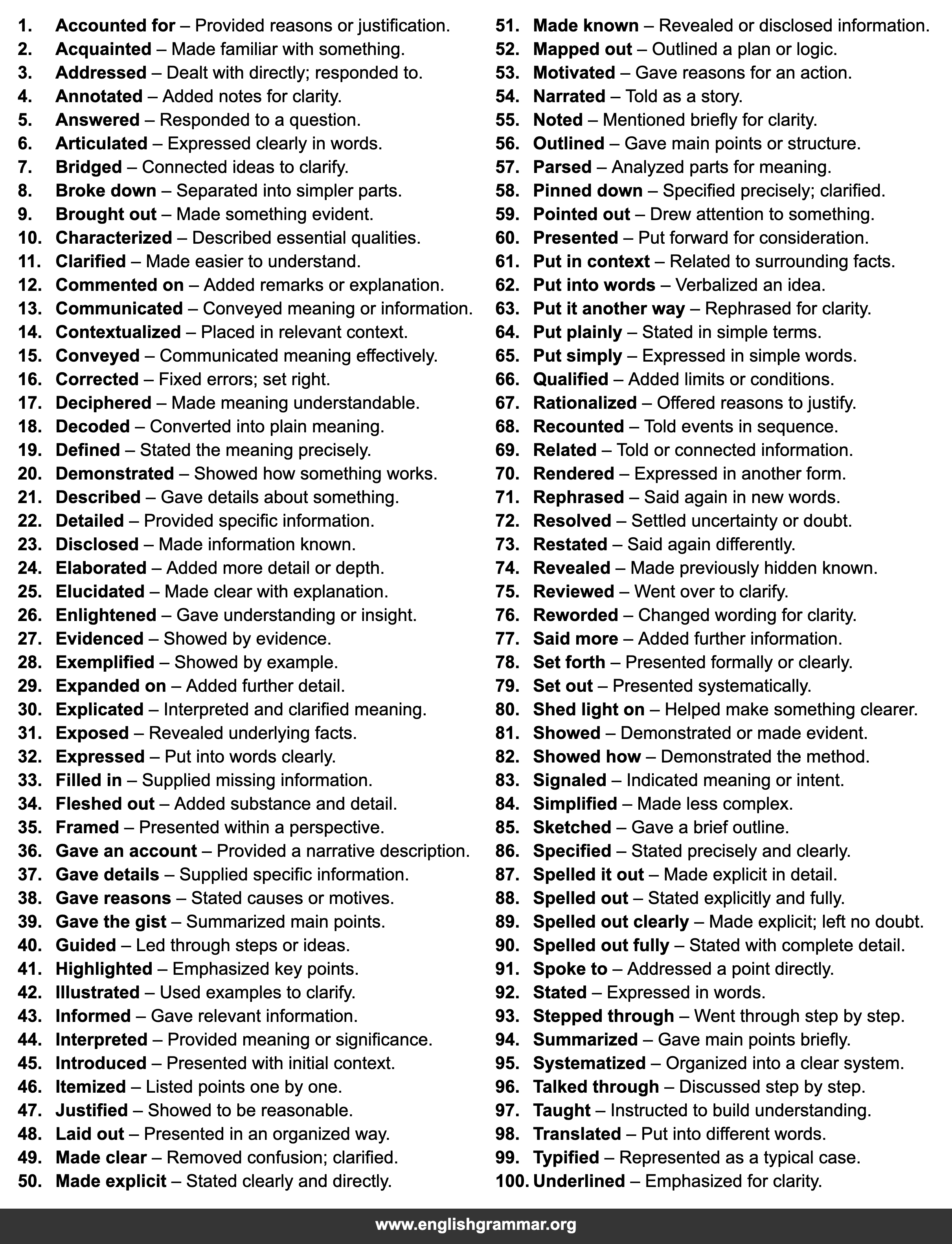 | 30. | Explicated | Interpreted and clarified meaning. |