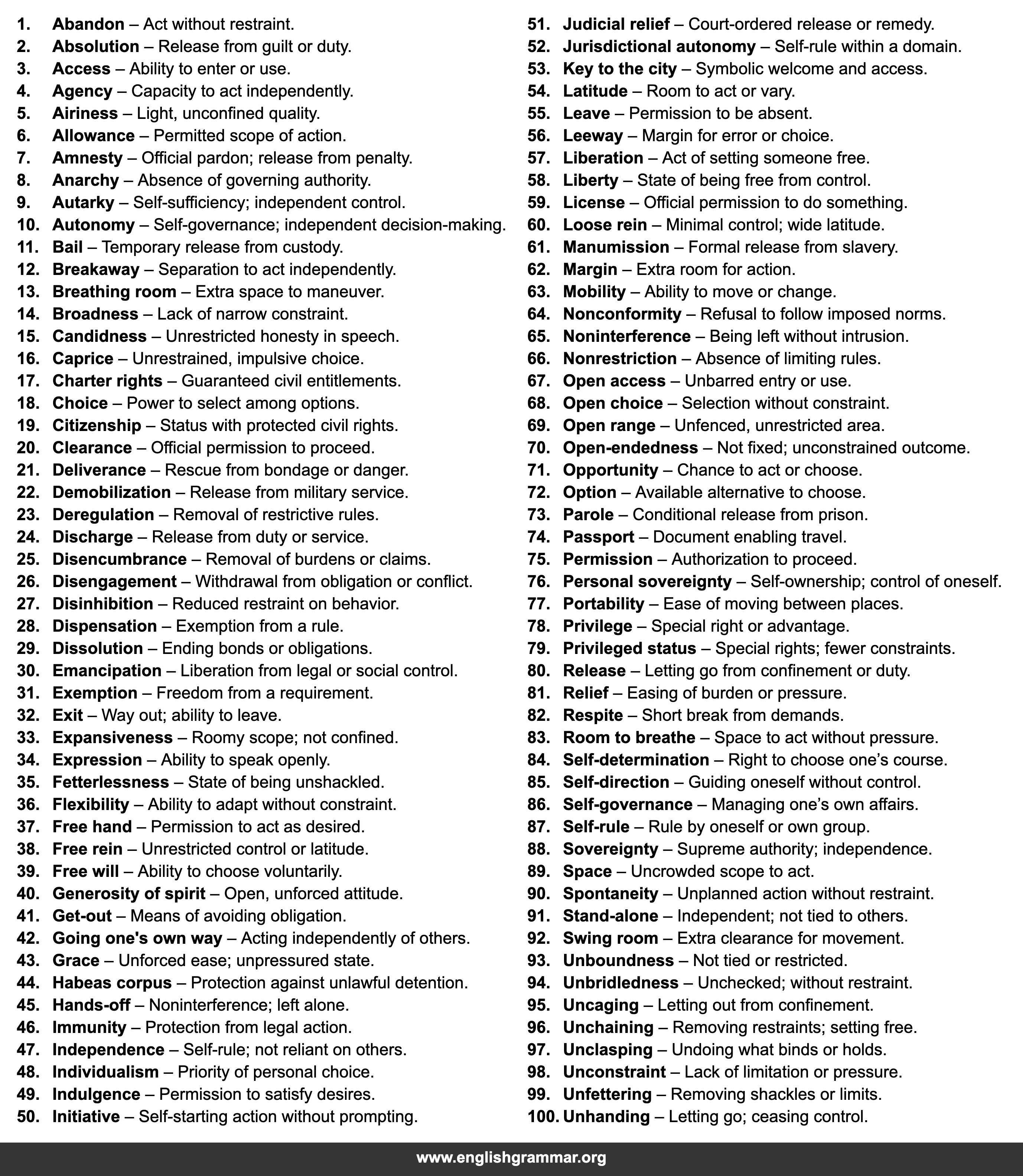 | 98. | Unconstraint | Lack of limitation or pressure. |