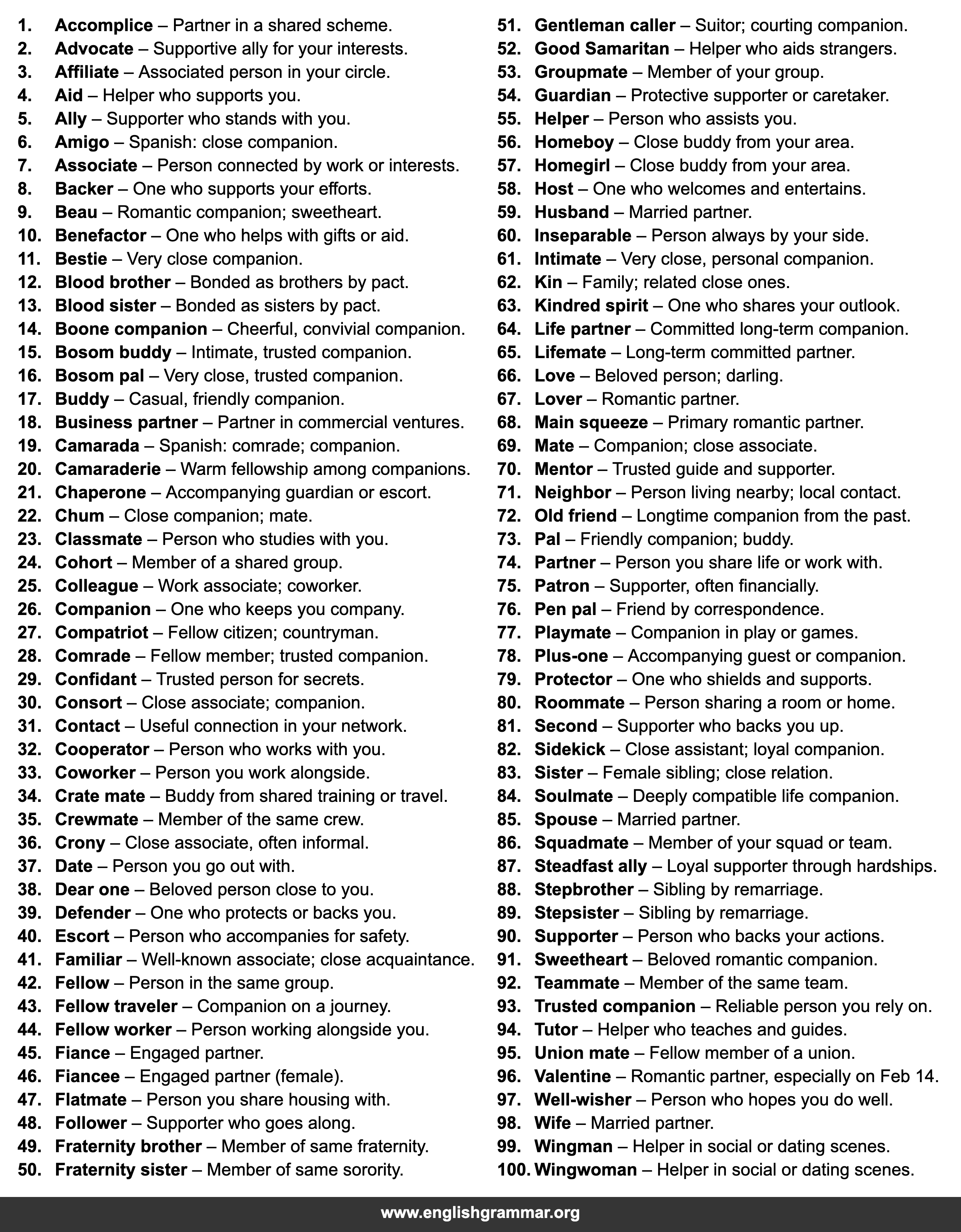 | 26. | Companion | One who keeps you company. |