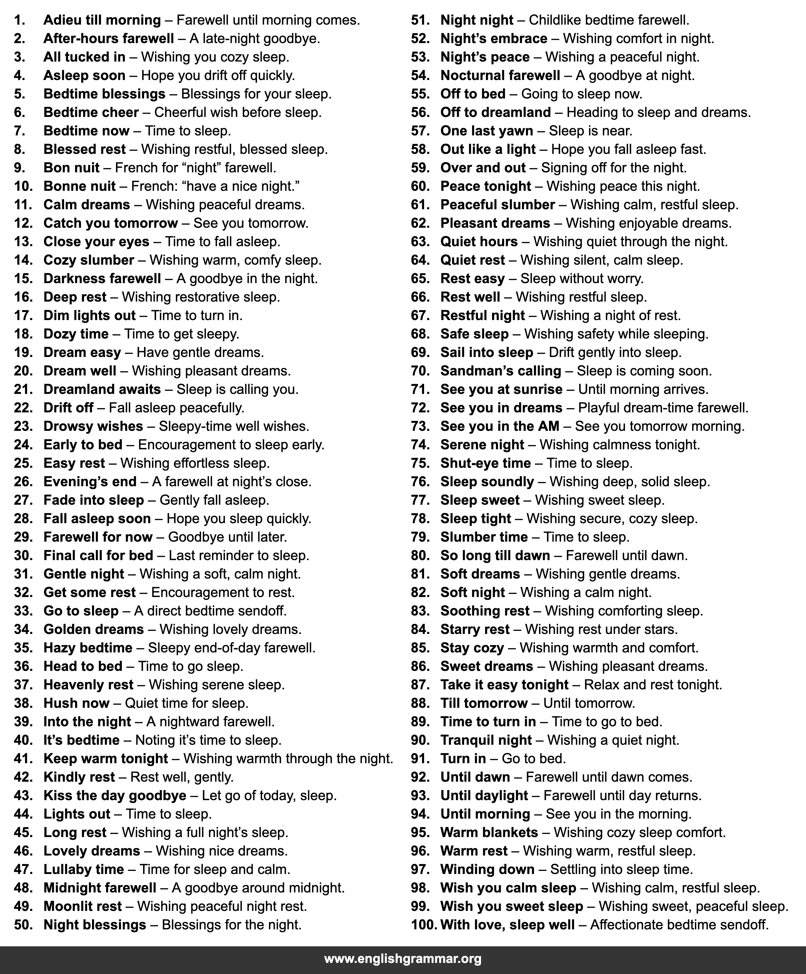 | 9. | Bon nuit | French for “night” farewell. |