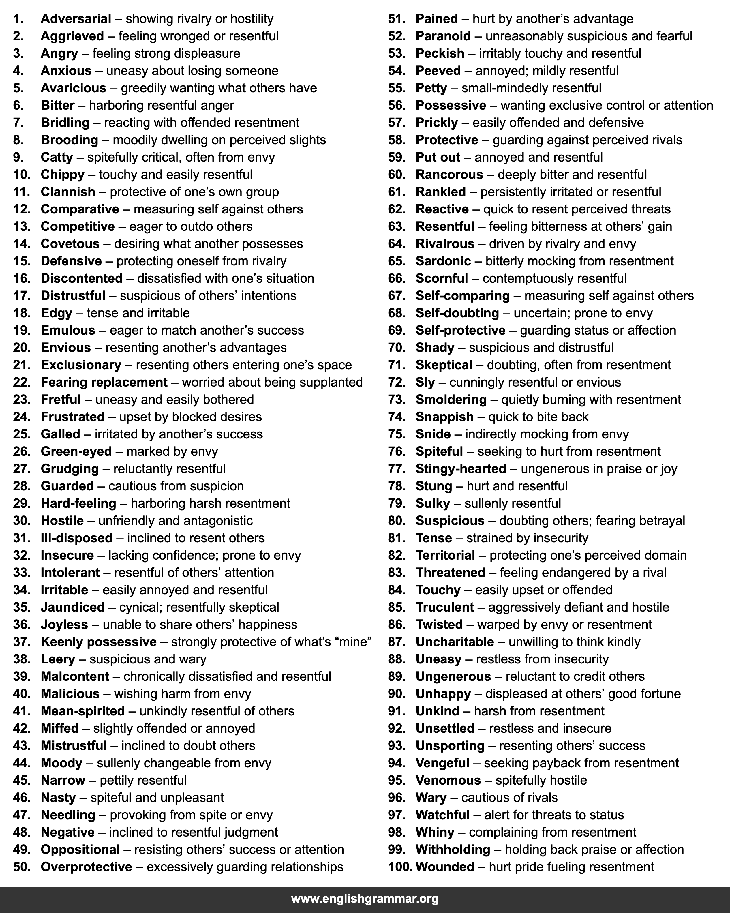 | 63. | Resentful | feeling bitterness at others’ gain |
