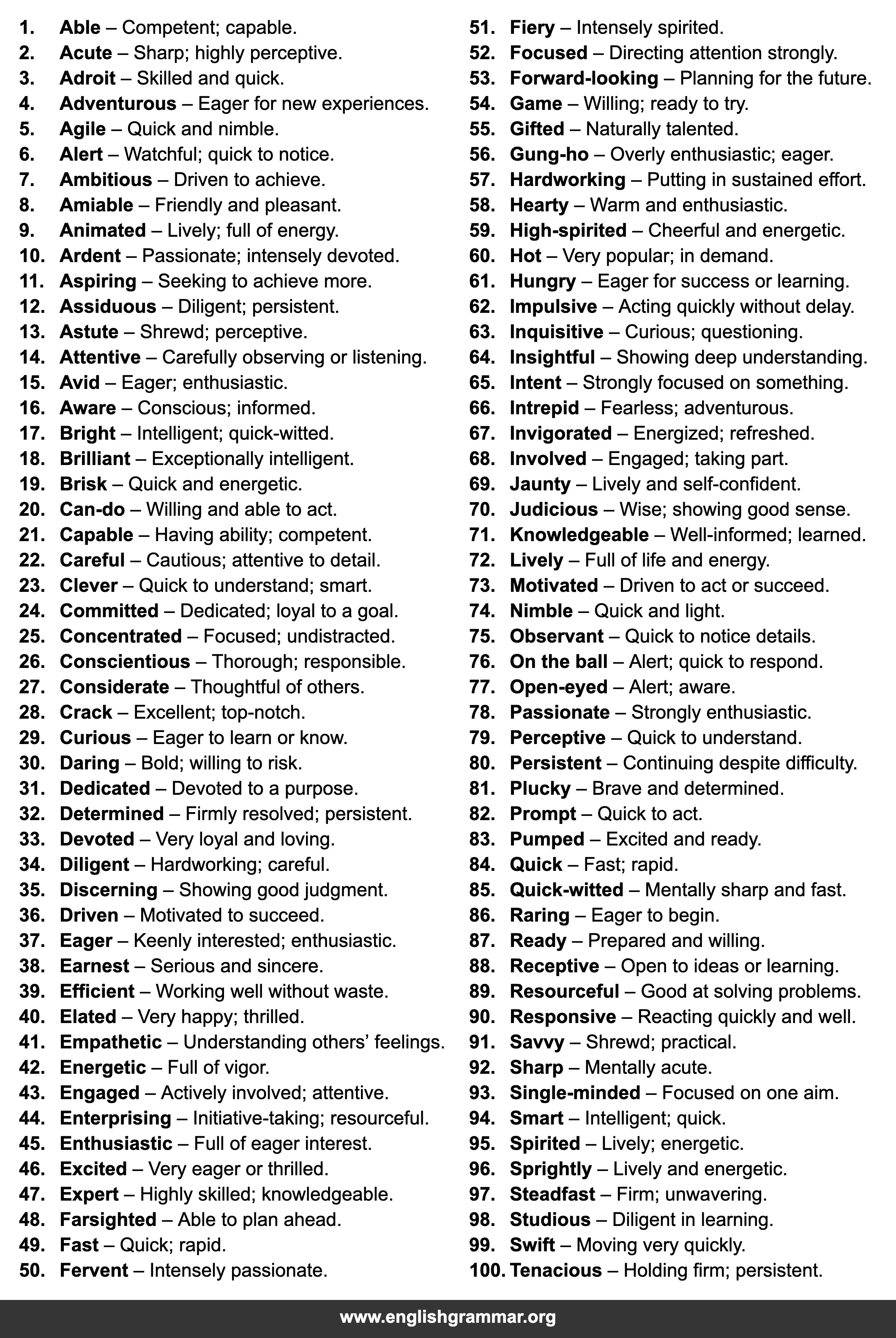 | 57. | Hardworking | Putting in sustained effort. |