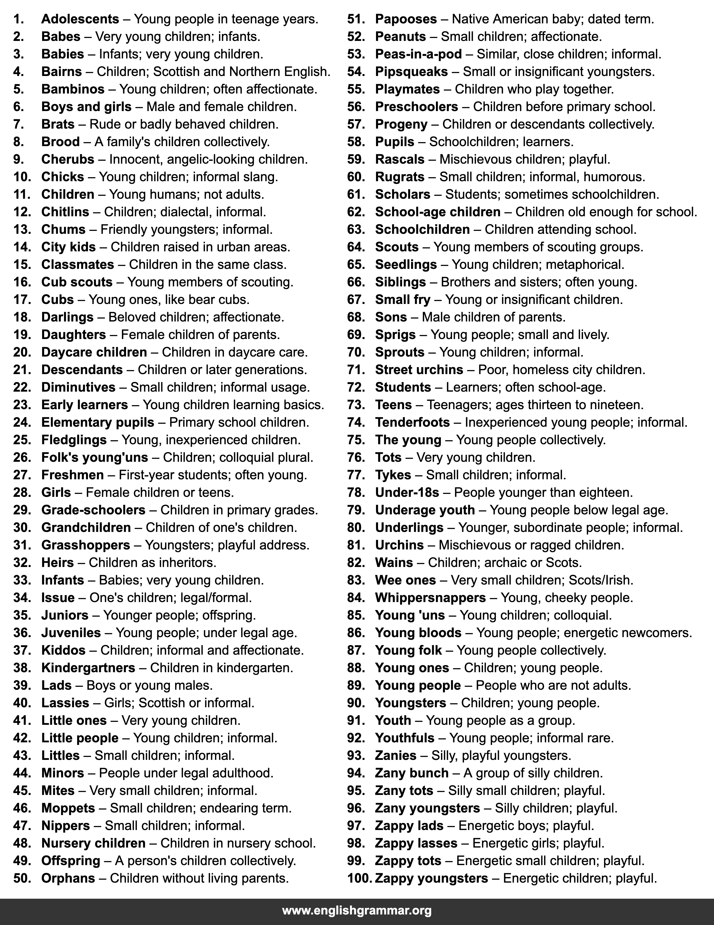 | 100. | Zappy youngsters | Energetic children; playful. |