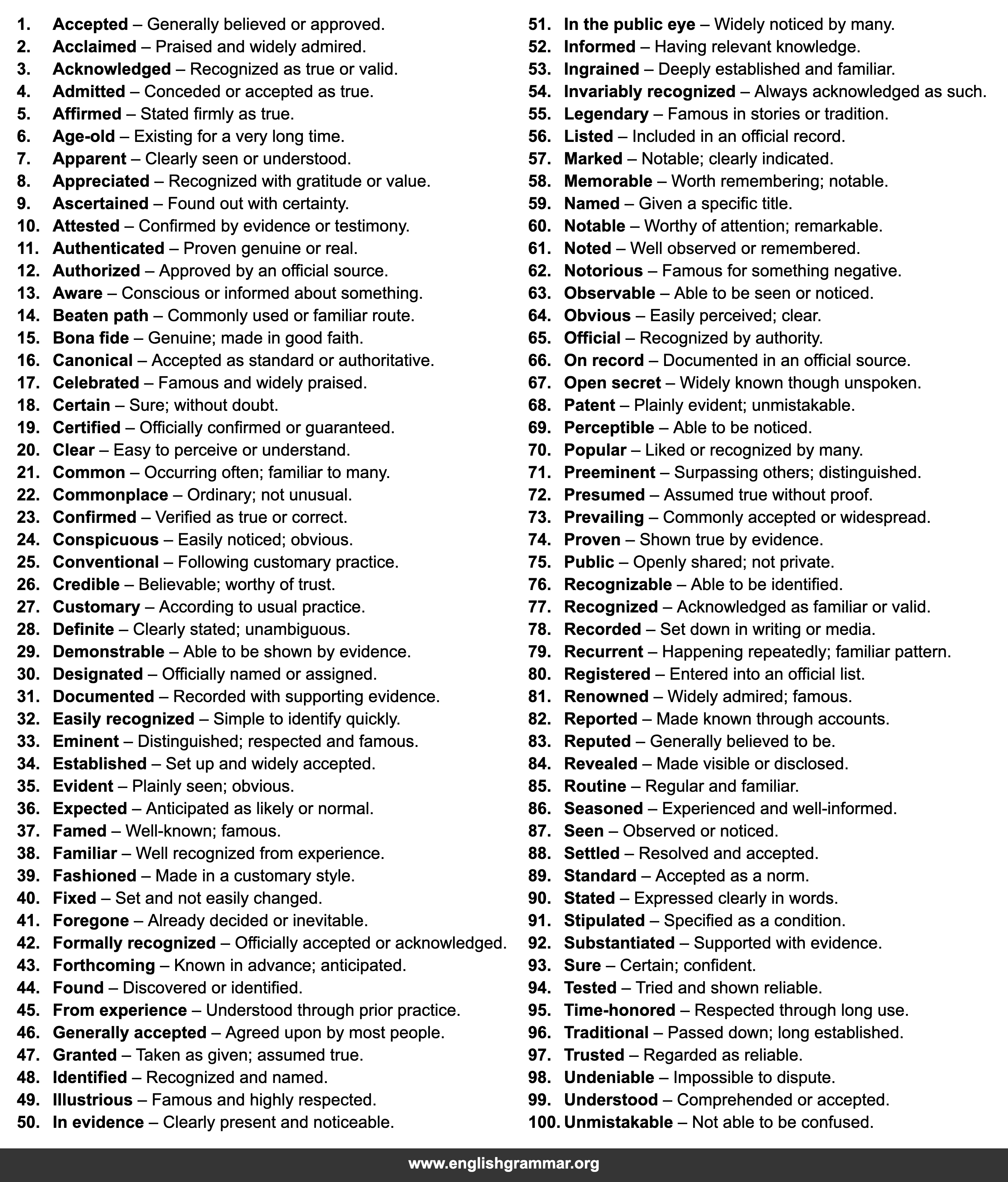 | 77. | Recognized | Acknowledged as familiar or valid. |