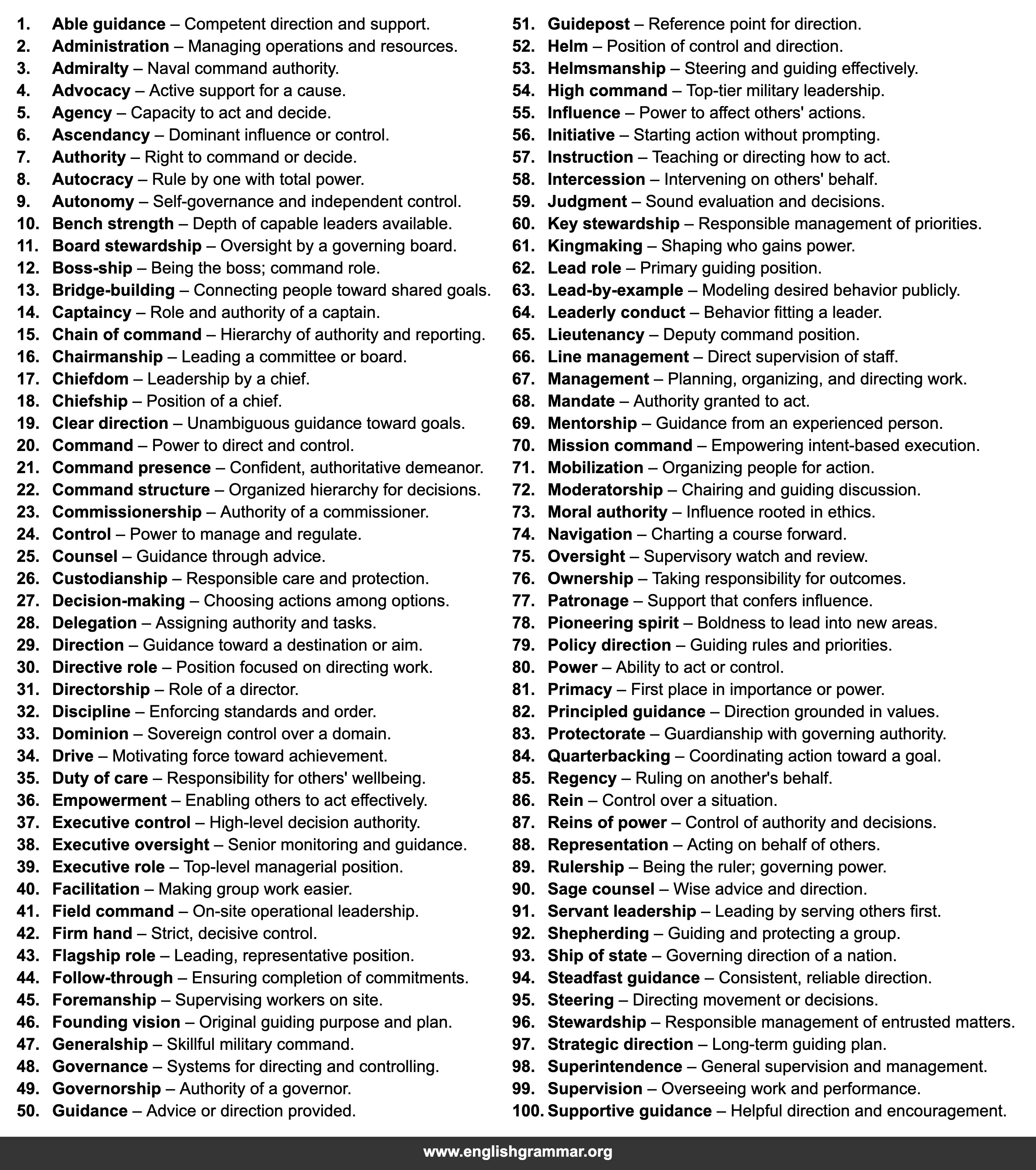 | 73. | Moral authority | Influence rooted in ethics. |