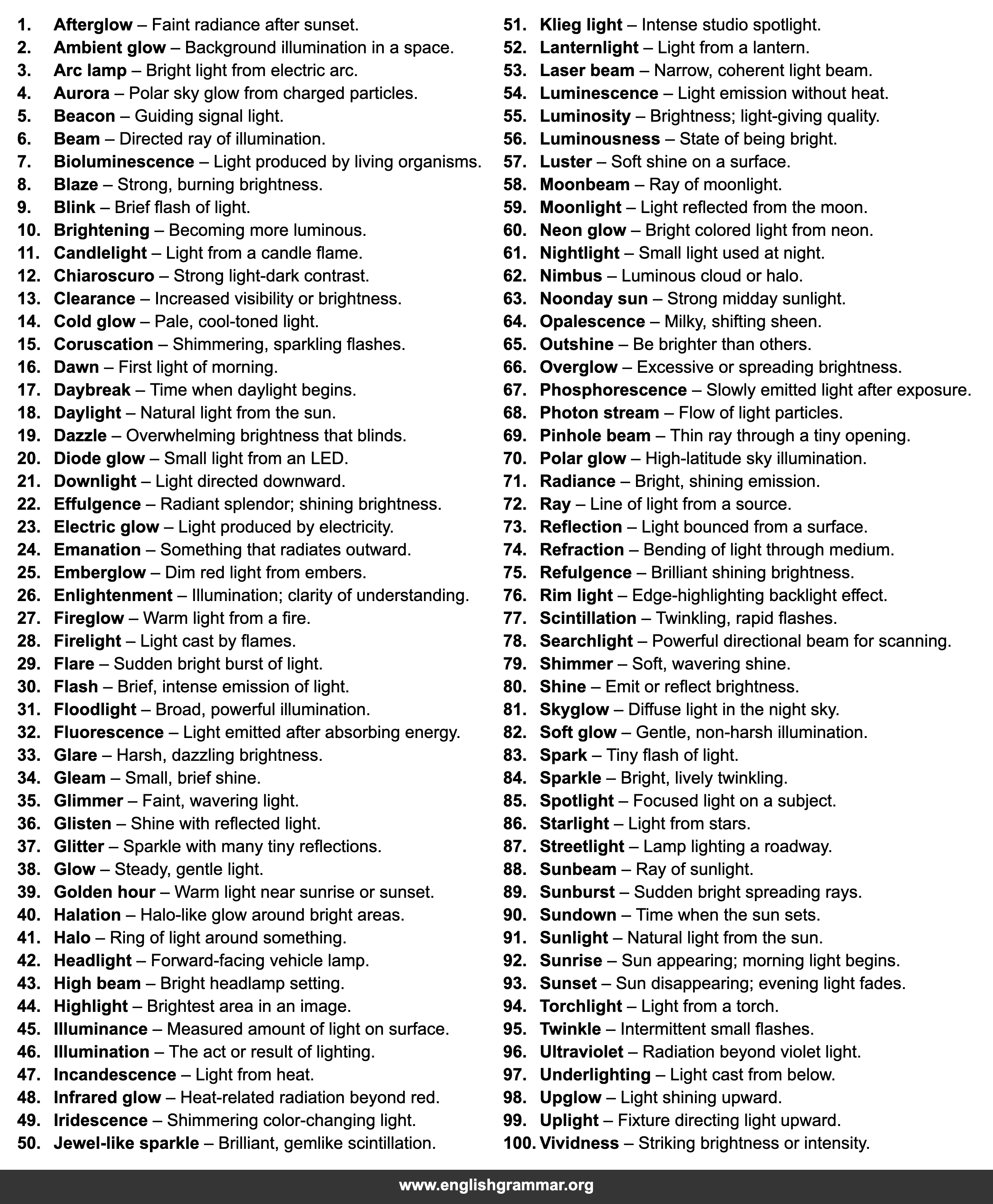 | 55. | Luminosity | Brightness; light-giving quality. |