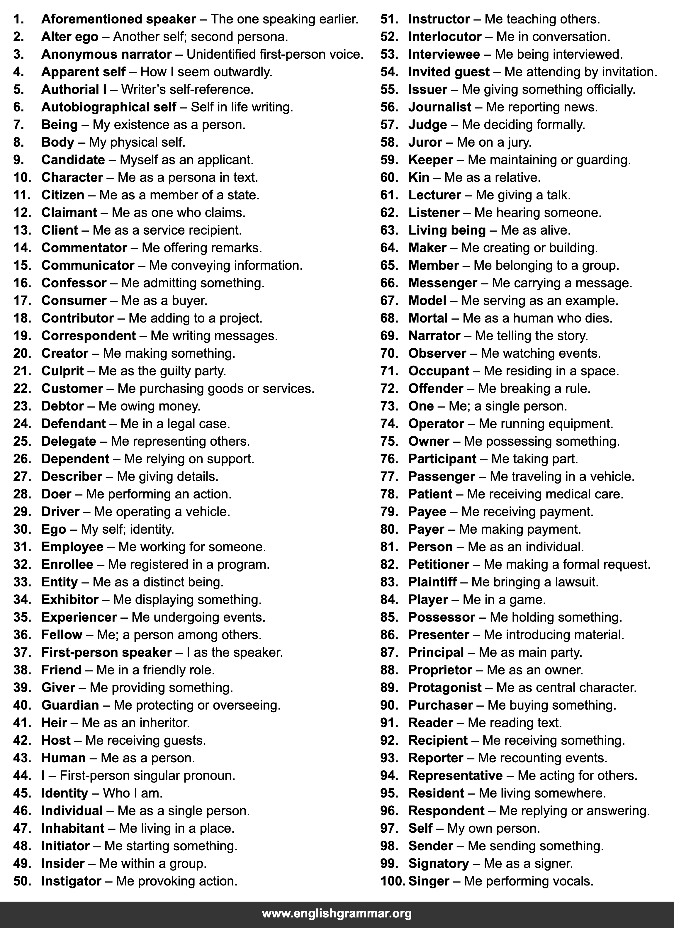 | 37. | First-person speaker | I as the speaker. |