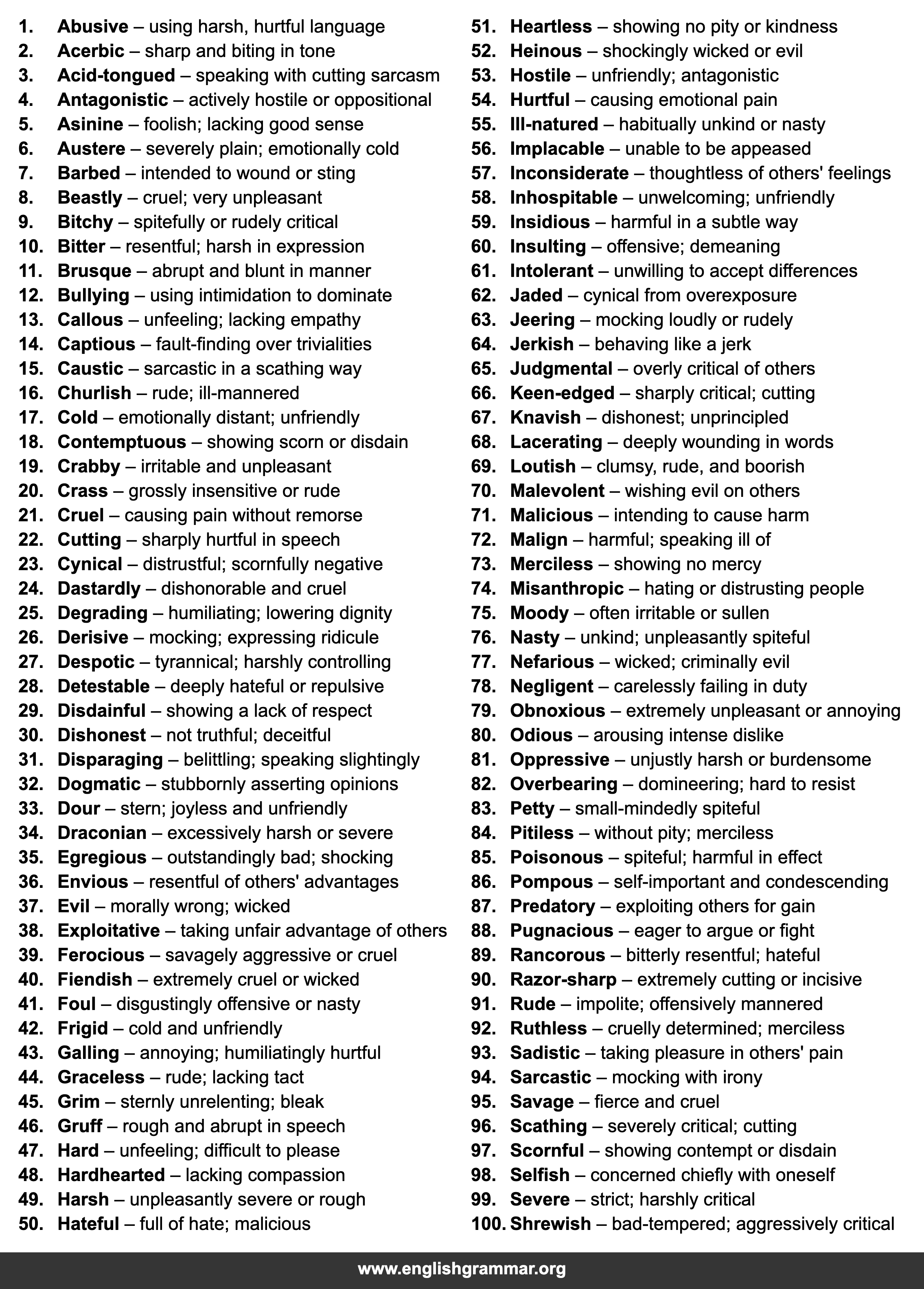 | 1. | Abusive | using harsh, hurtful language |