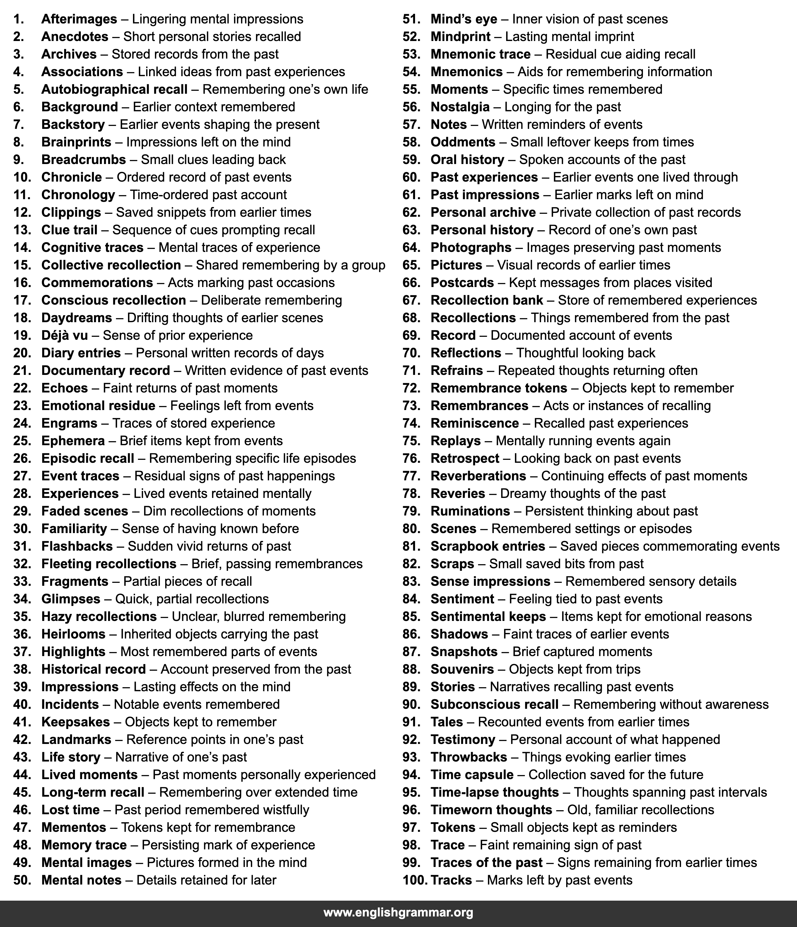 | 32. | Fleeting recollections | Brief, passing remembrances |
