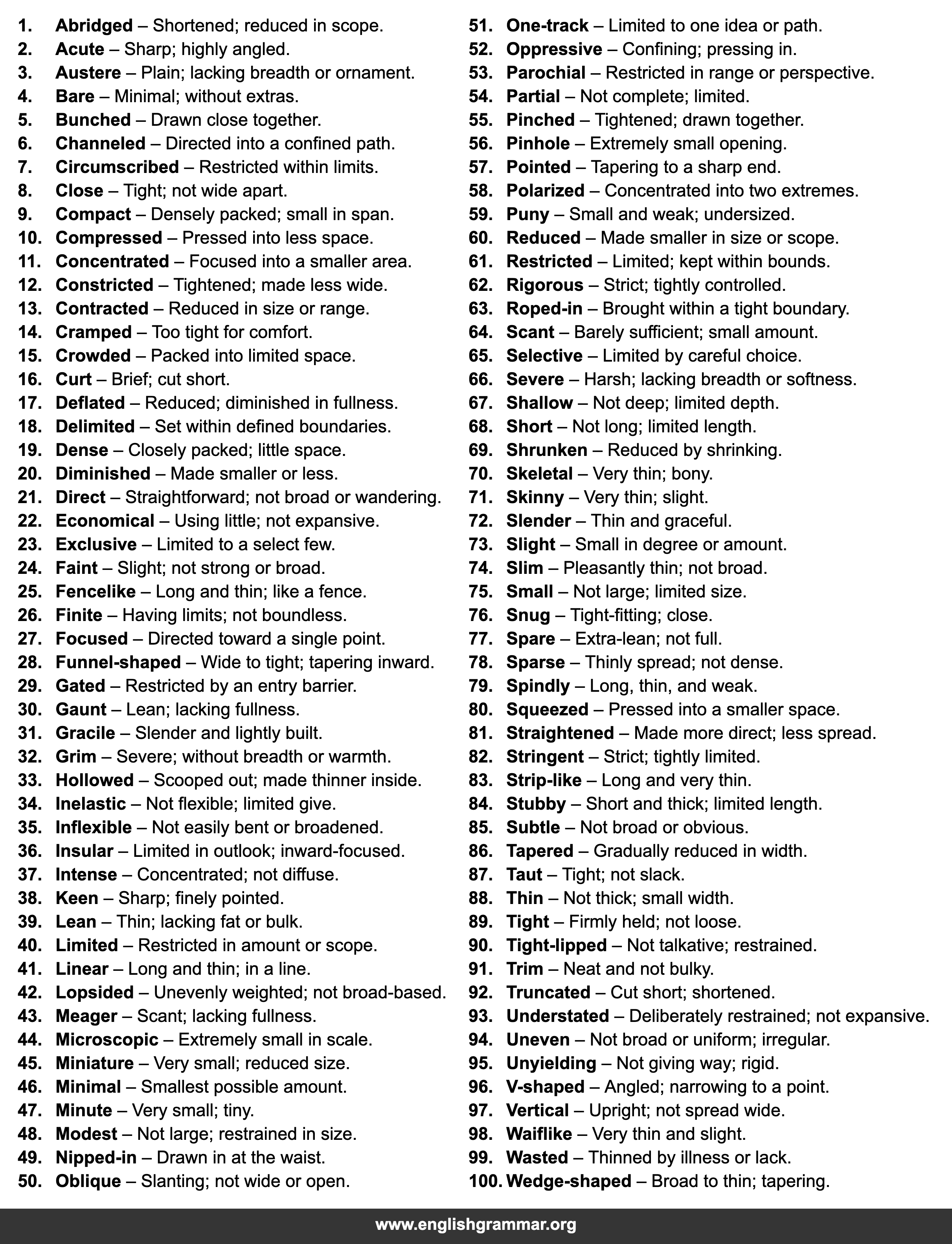 | 61. | Restricted | Limited; kept within bounds. |