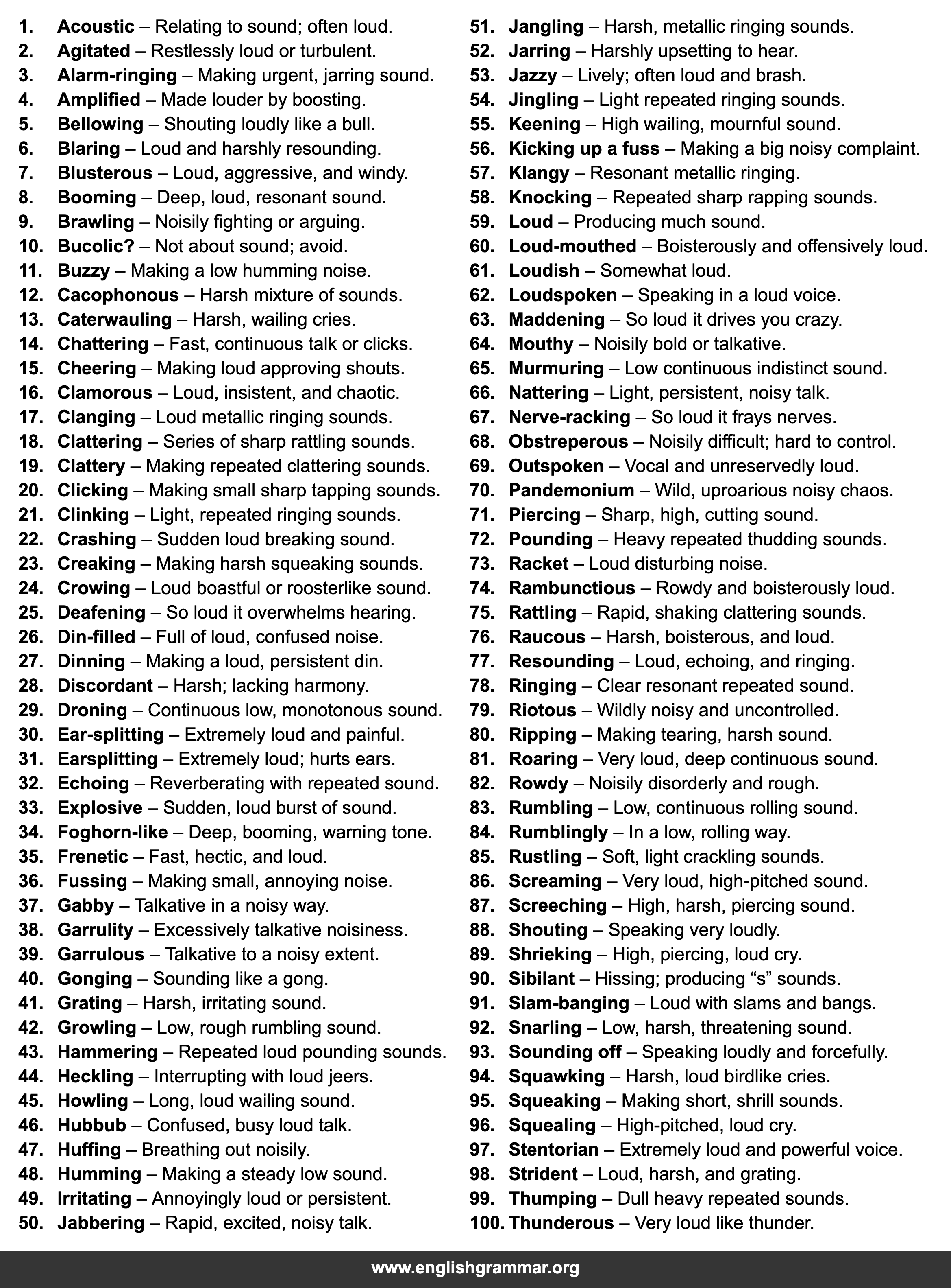 | 51. | Jangling | Harsh, metallic ringing sounds. |