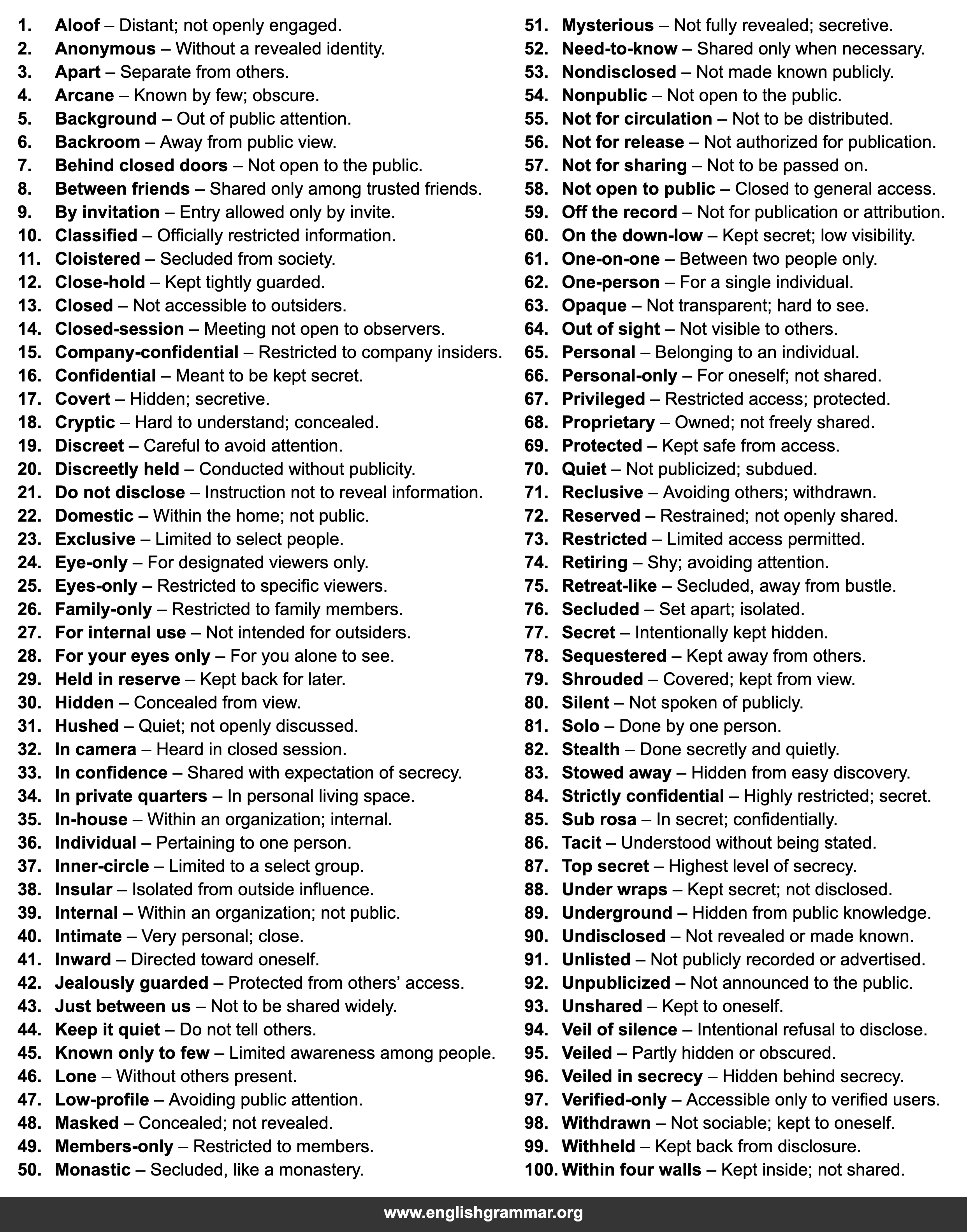 | 84. | Strictly confidential | Highly restricted; secret. |
