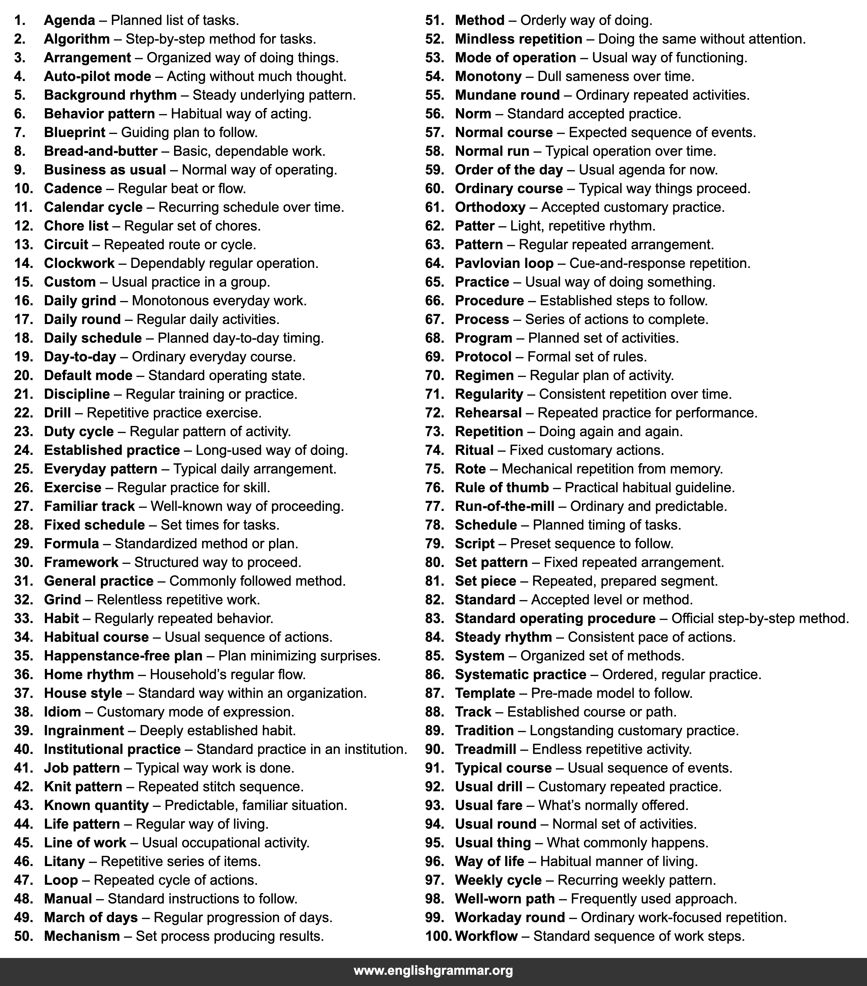 | 34. | Habitual course | Usual sequence of actions. |