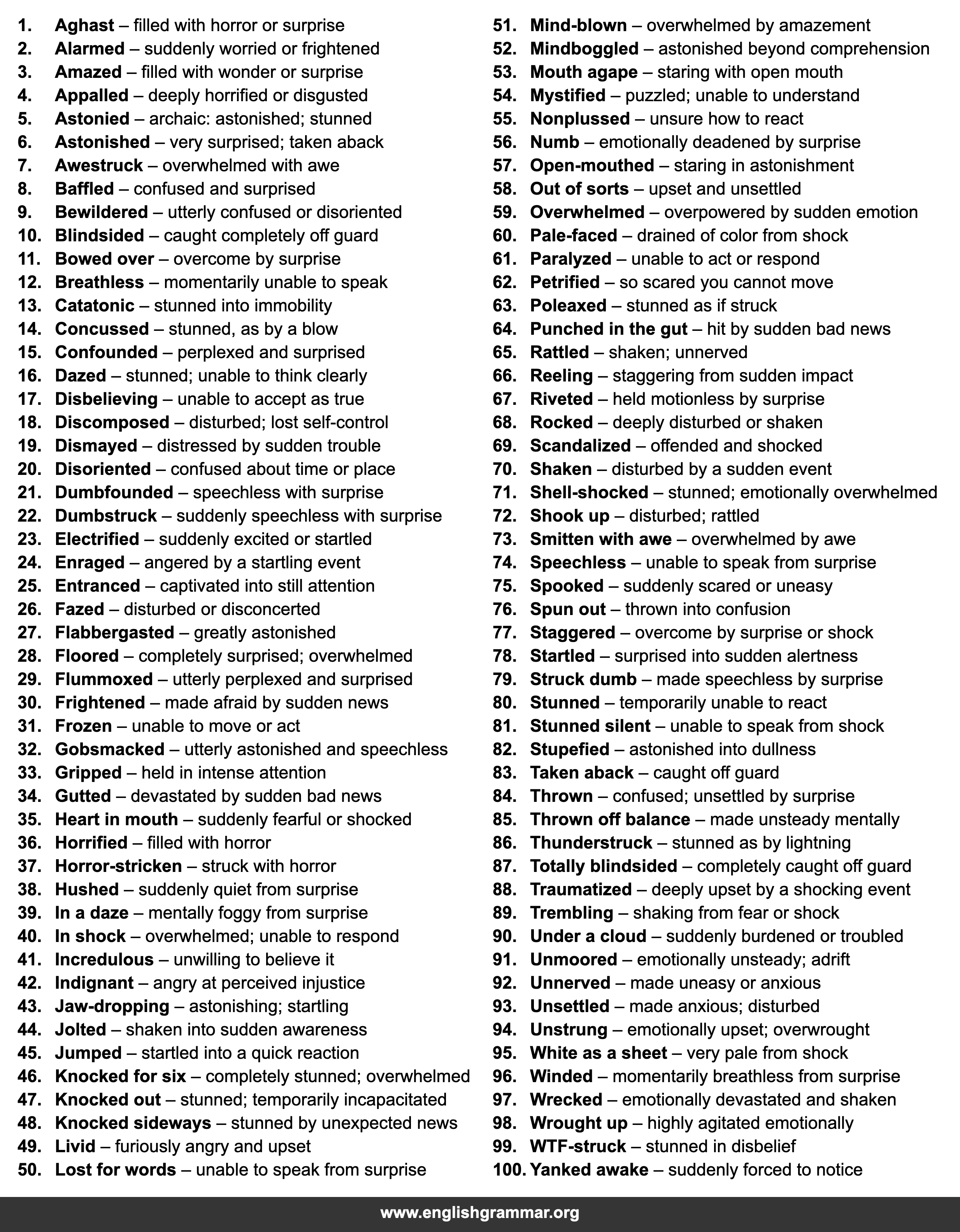 | 21. | Dumbfounded | speechless with surprise |