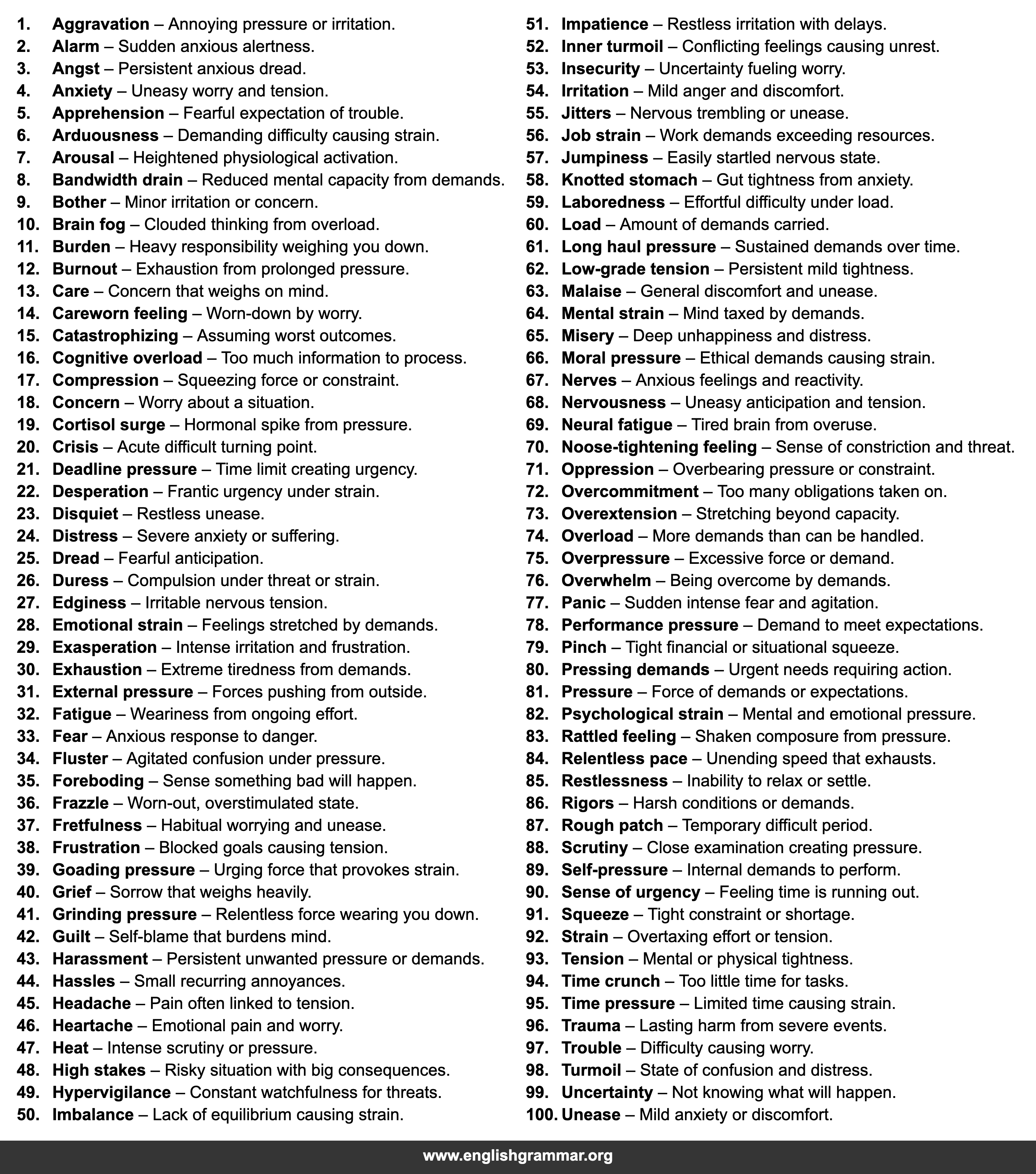 | 82. | Psychological strain | Mental and emotional pressure. |