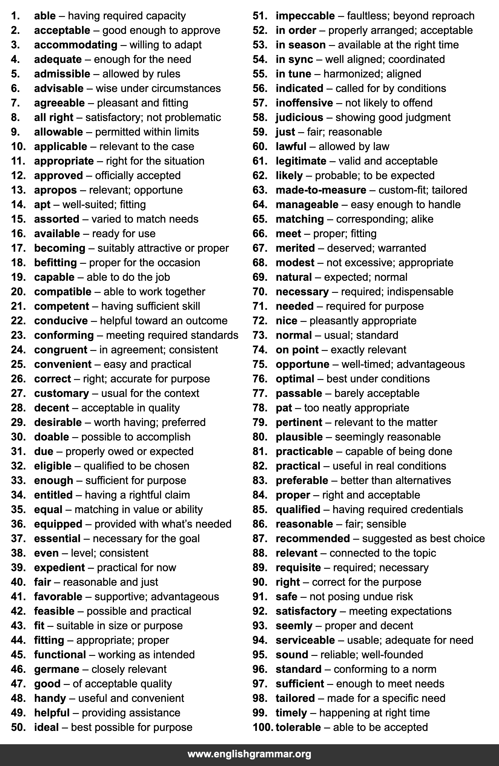 | 92. | satisfactory | meeting expectations |