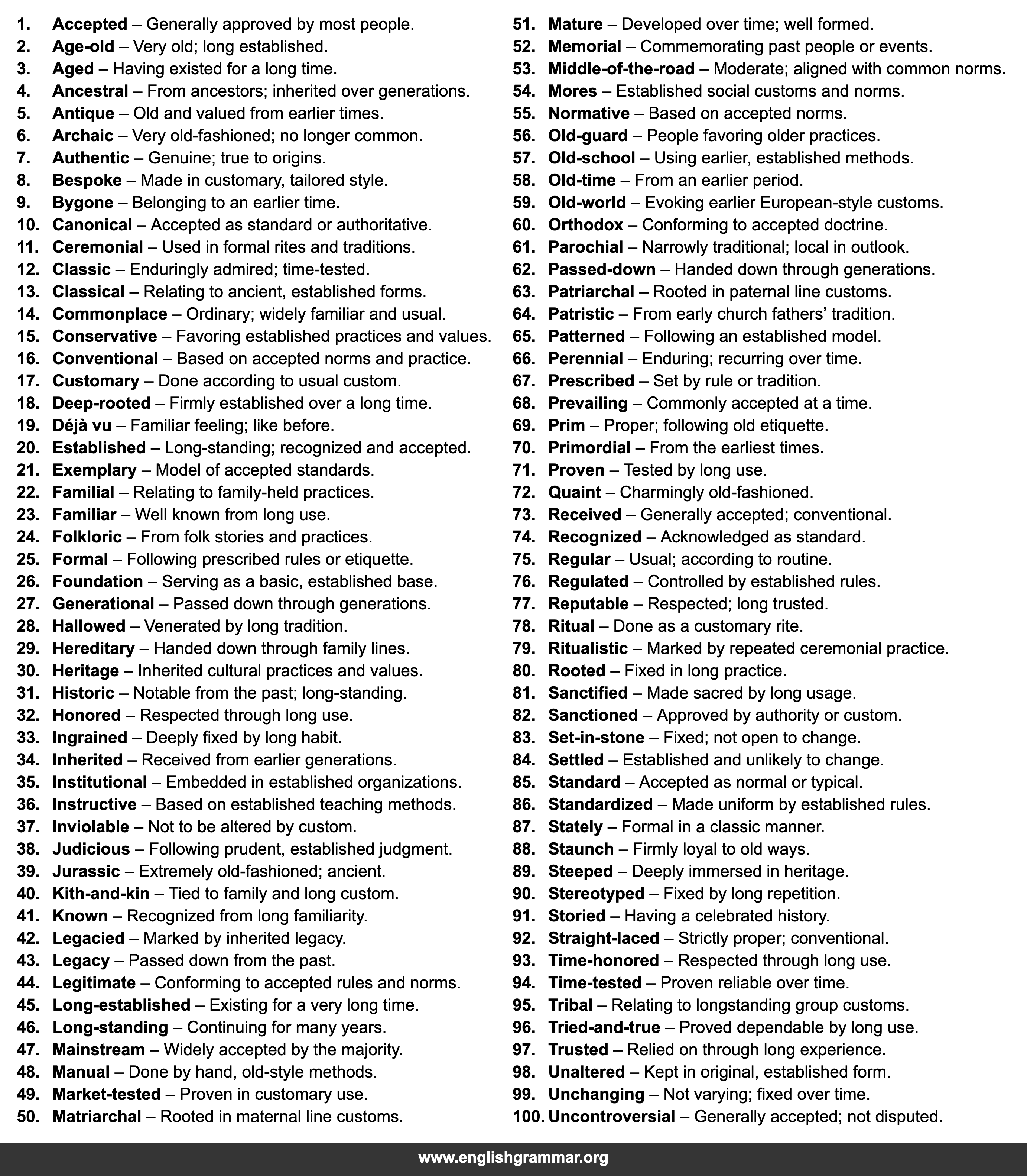 | 20. | Established | Long-standing; recognized and accepted. |