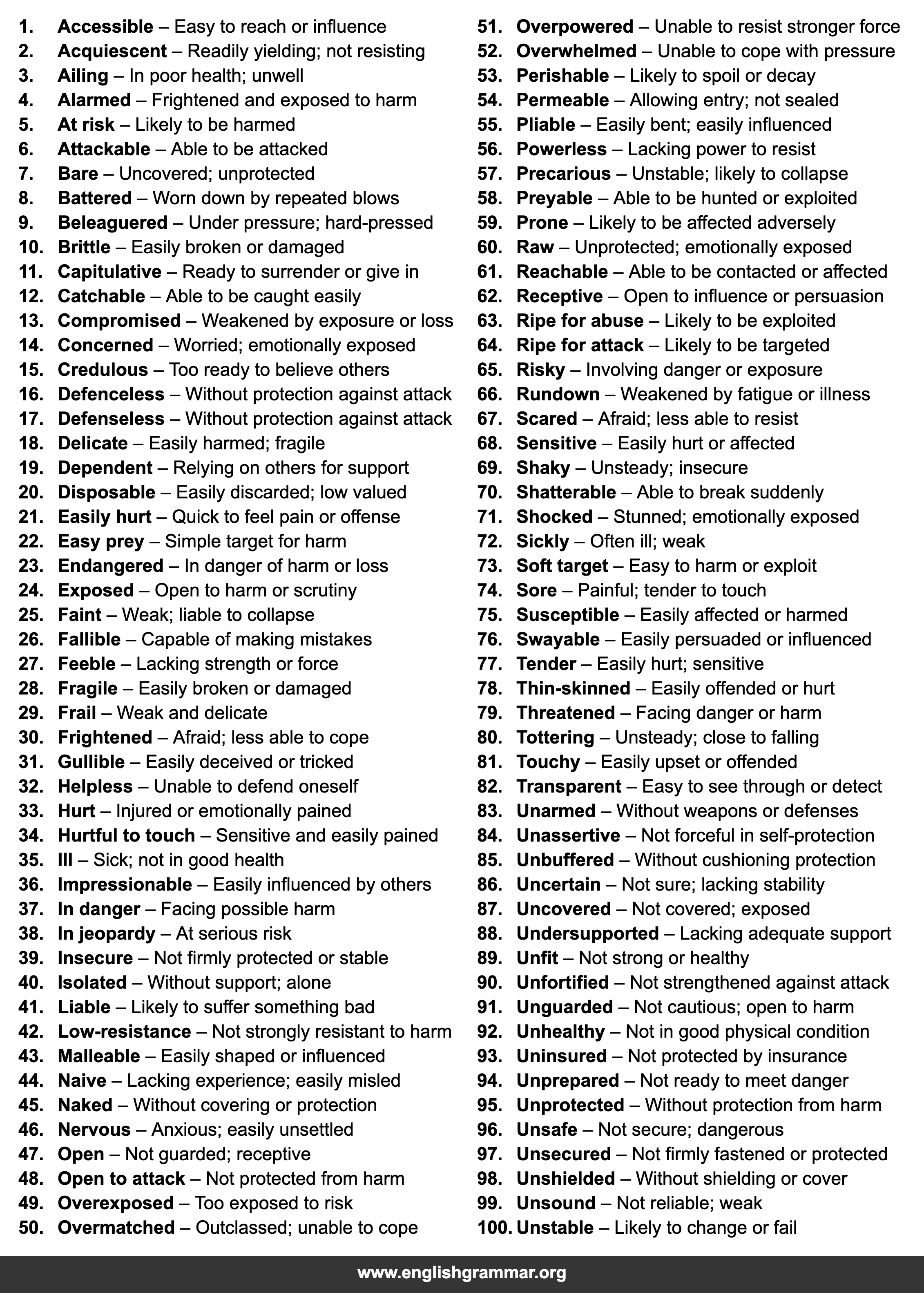 | 21. | Easily hurt | Quick to feel pain or offense |