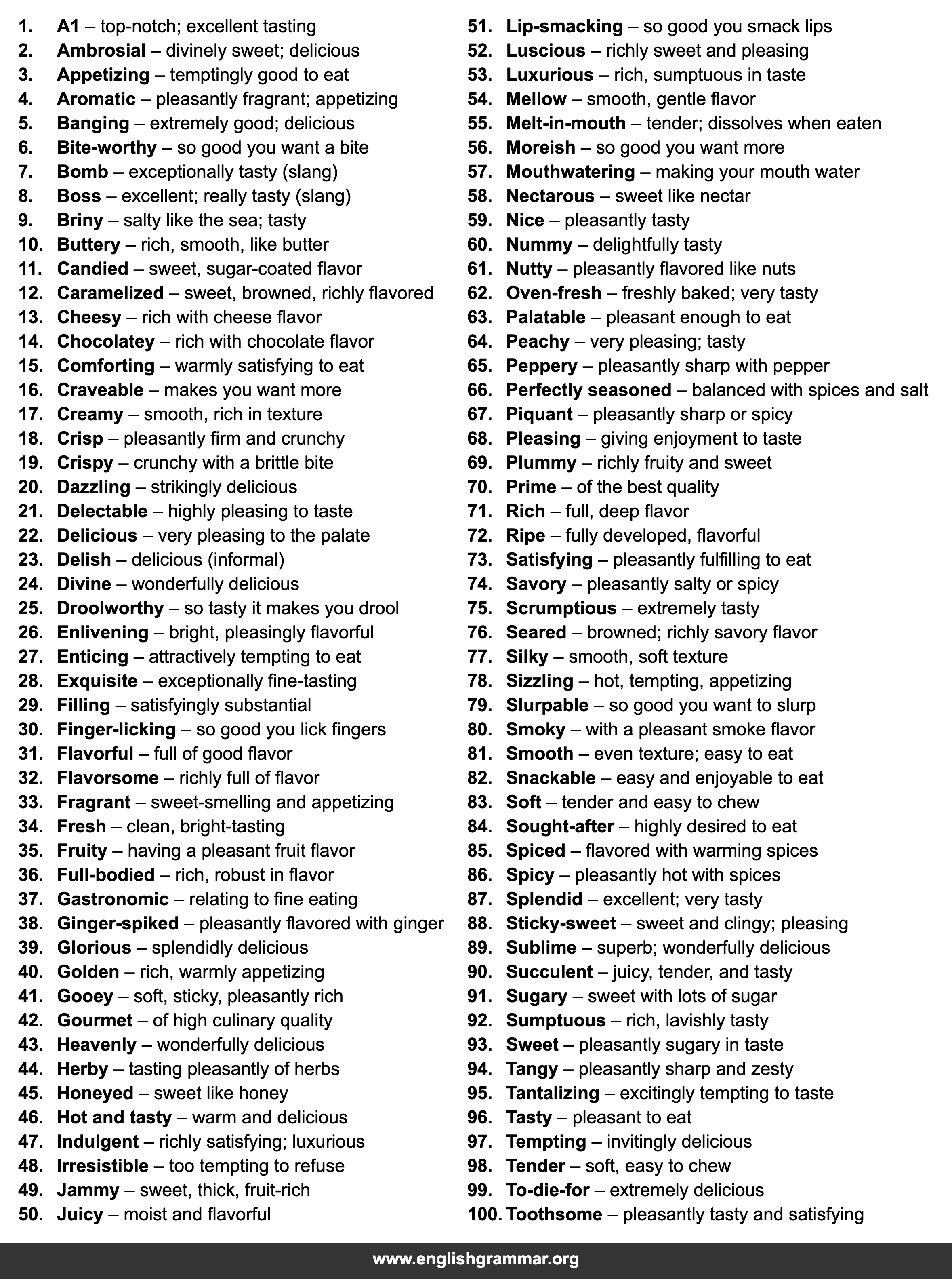 | 73. | Satisfying | pleasantly fulfilling to eat |