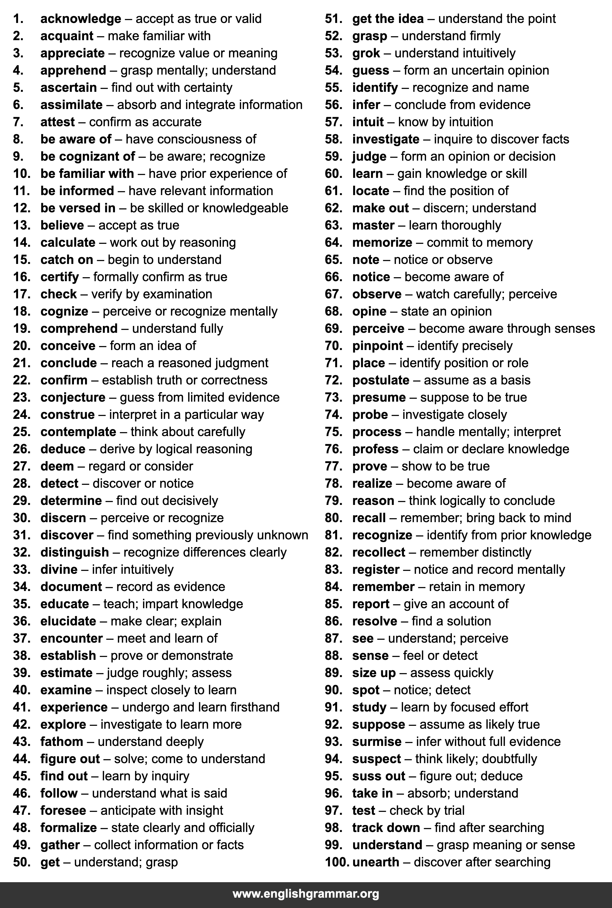 | 99. | understand | grasp meaning or sense |