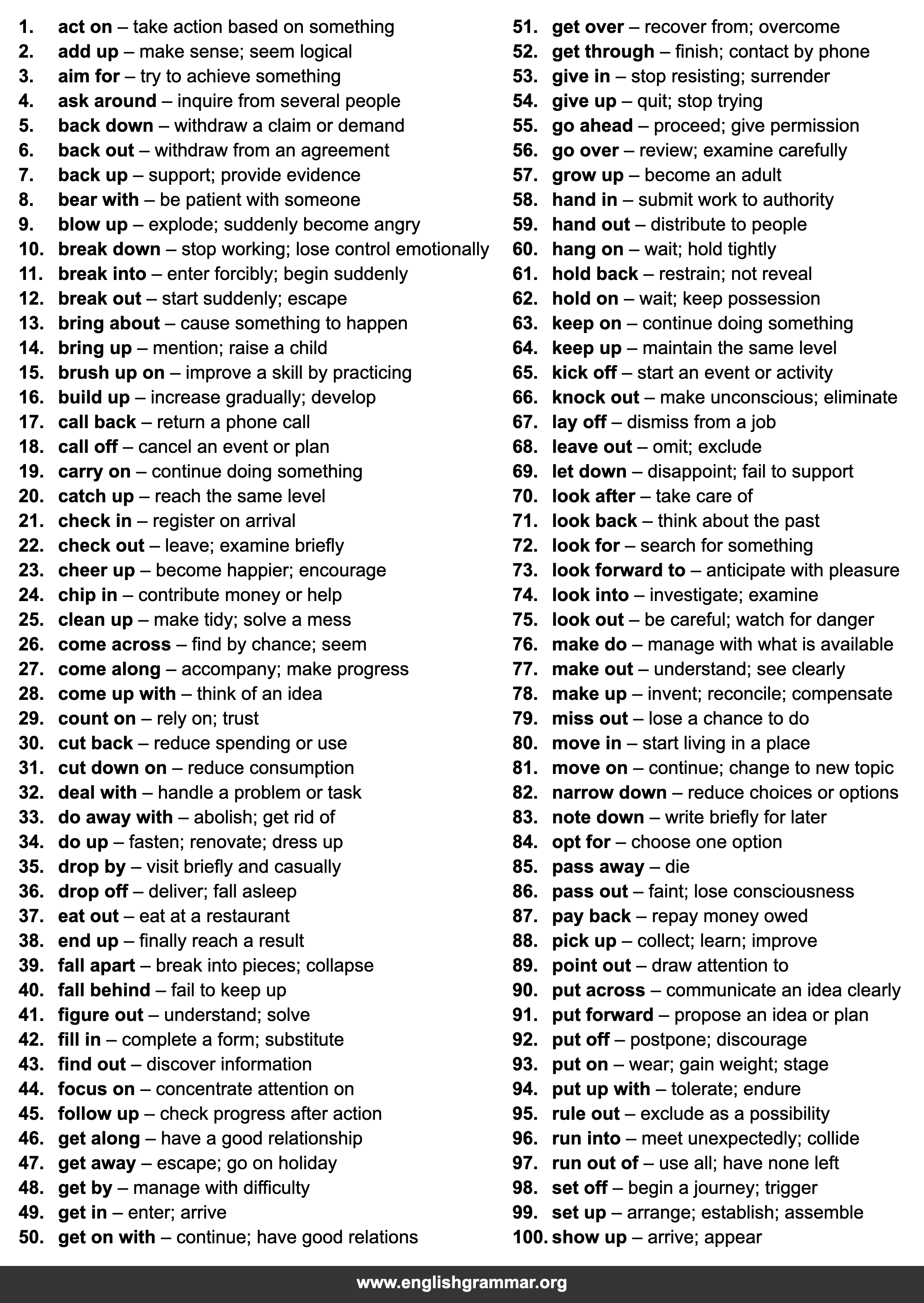 | 63. | keep on | continue doing something |