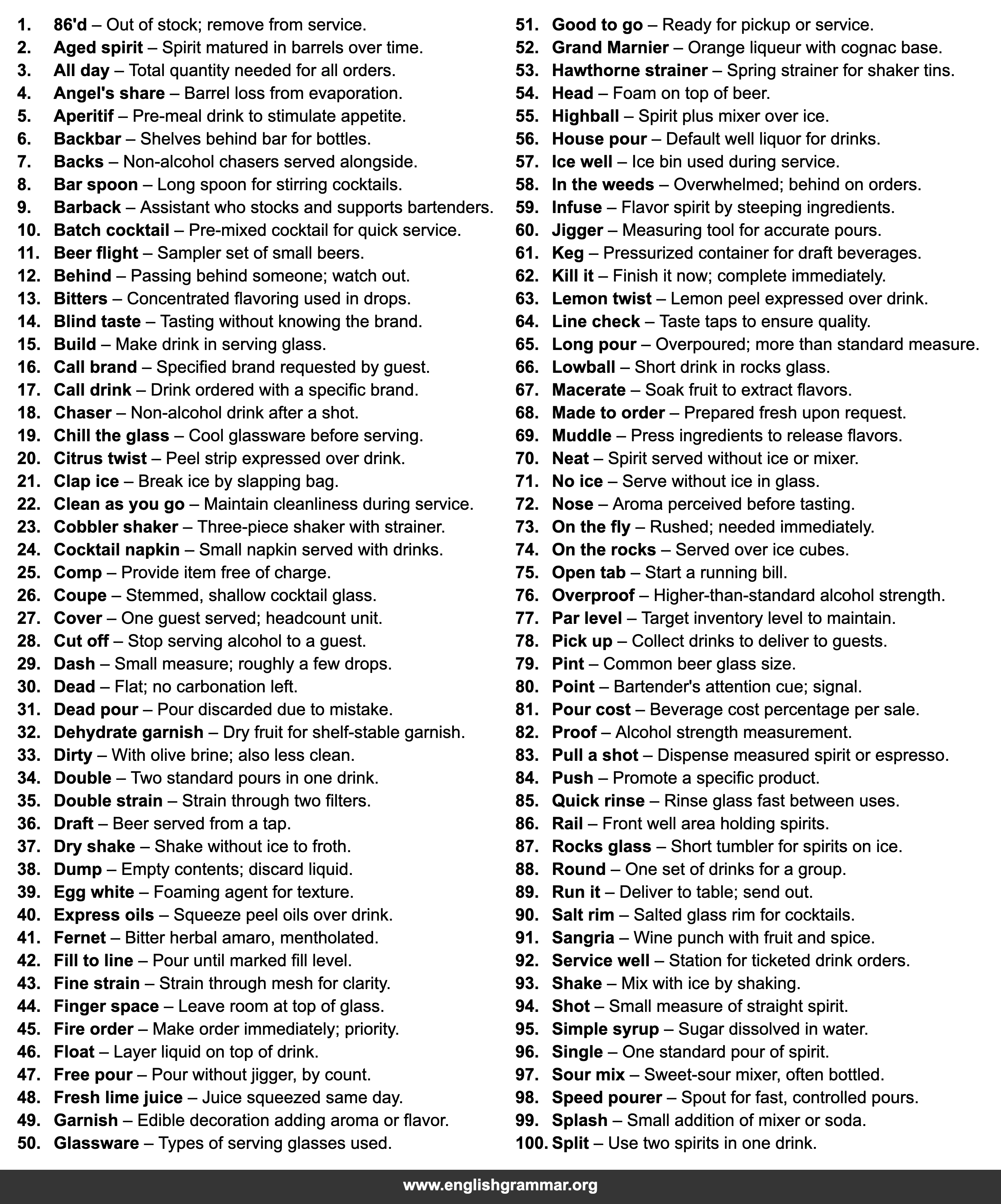 | 83. | Pull a shot | Dispense measured spirit or espresso. |