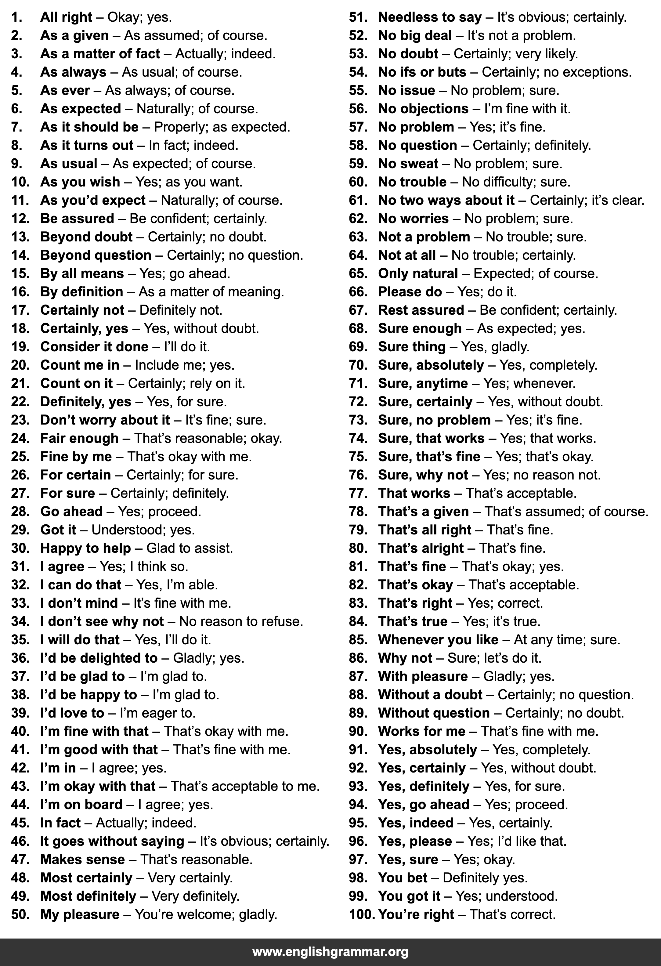 | 75. | Sure, that’s fine | Yes; that’s okay. |