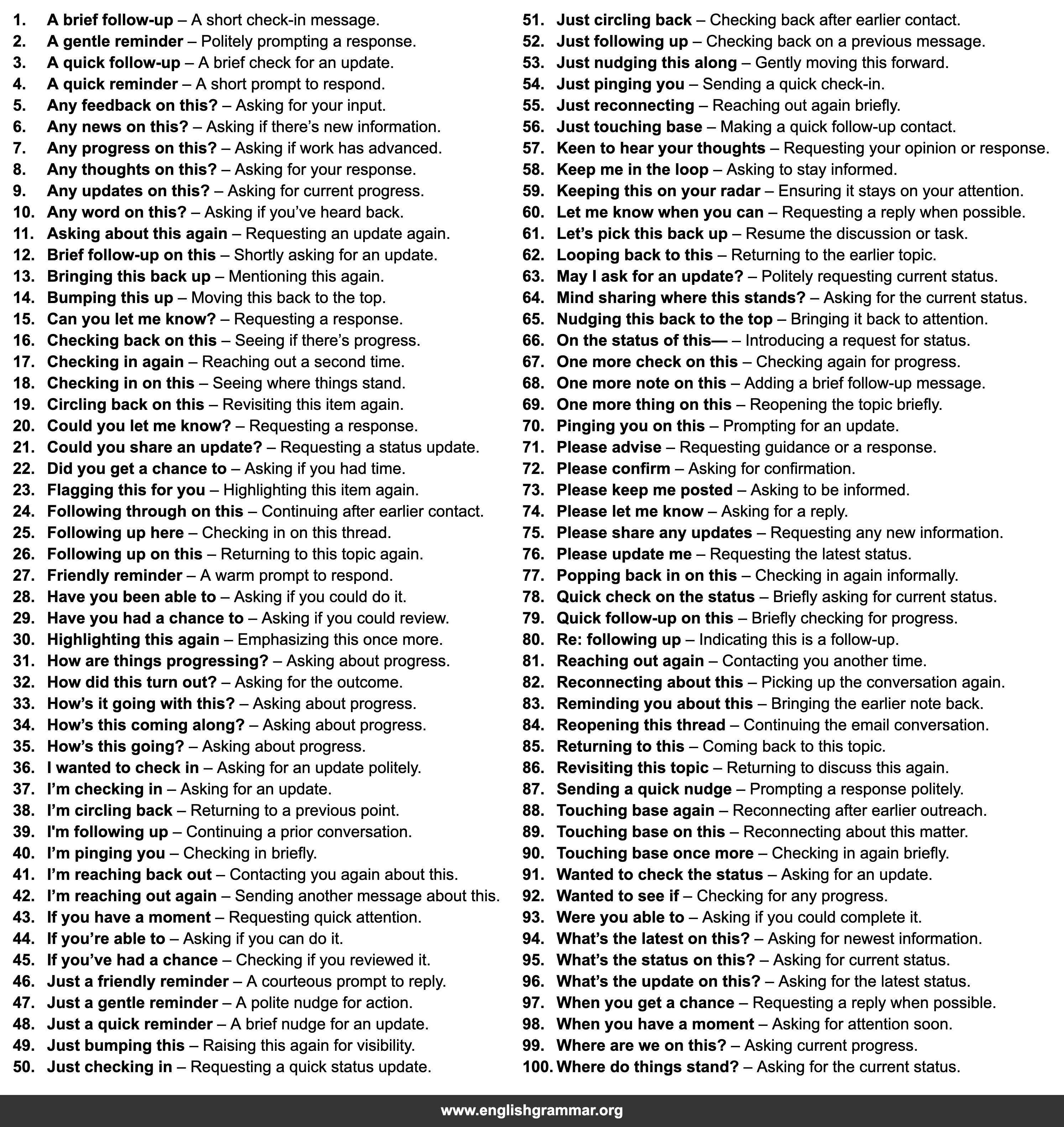 | 12. | Brief follow-up on this | Shortly asking for an update. |