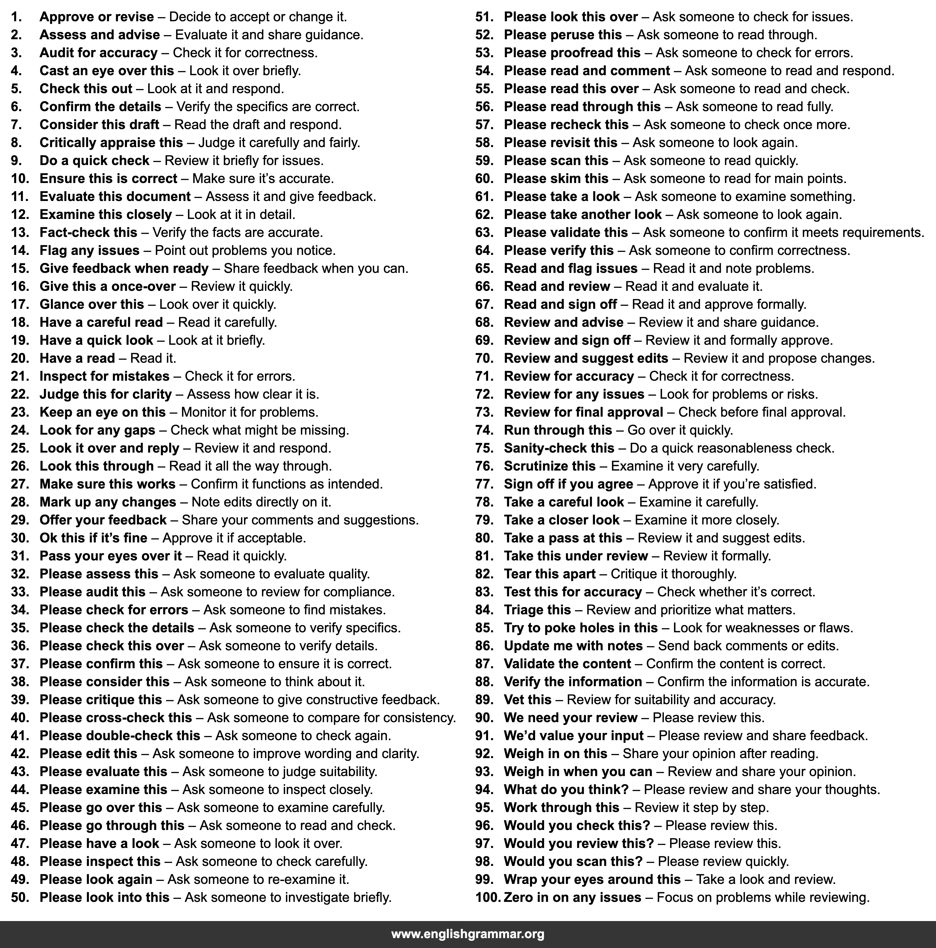 | 71. | Review for accuracy | Check it for correctness. |