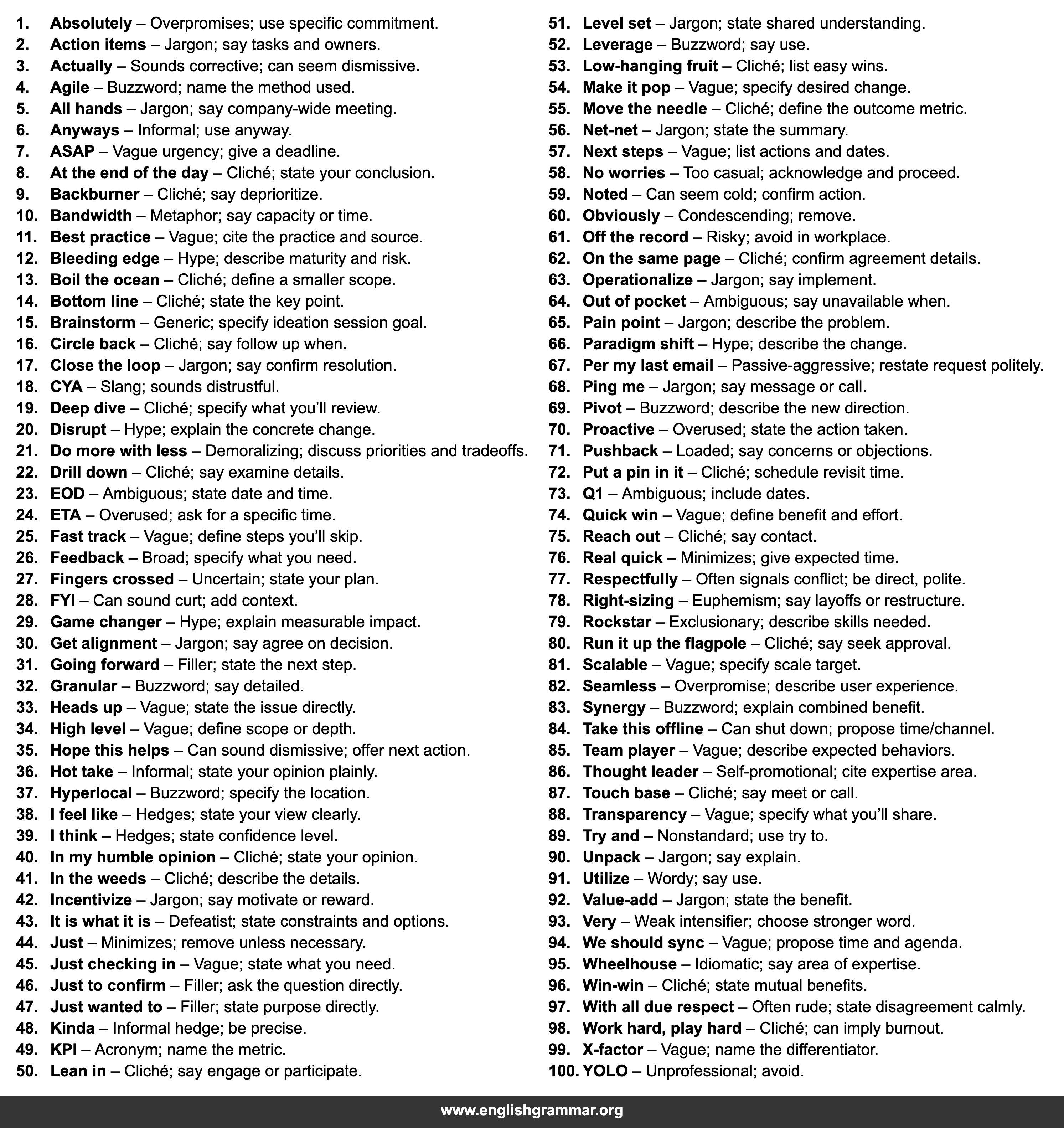 | 5. | All hands | Jargon; say company-wide meeting. |