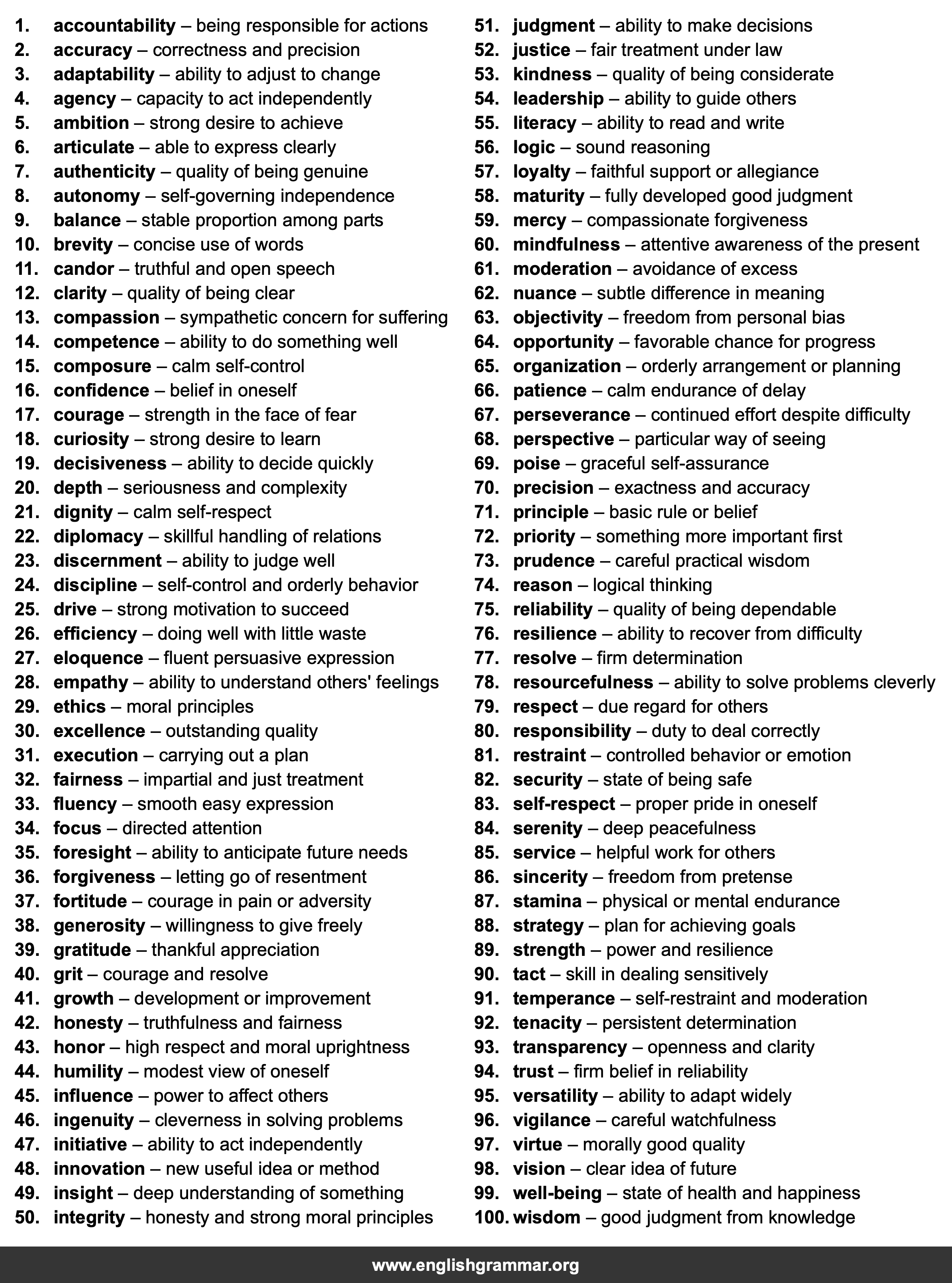 | 50. | integrity | honesty and strong moral principles |