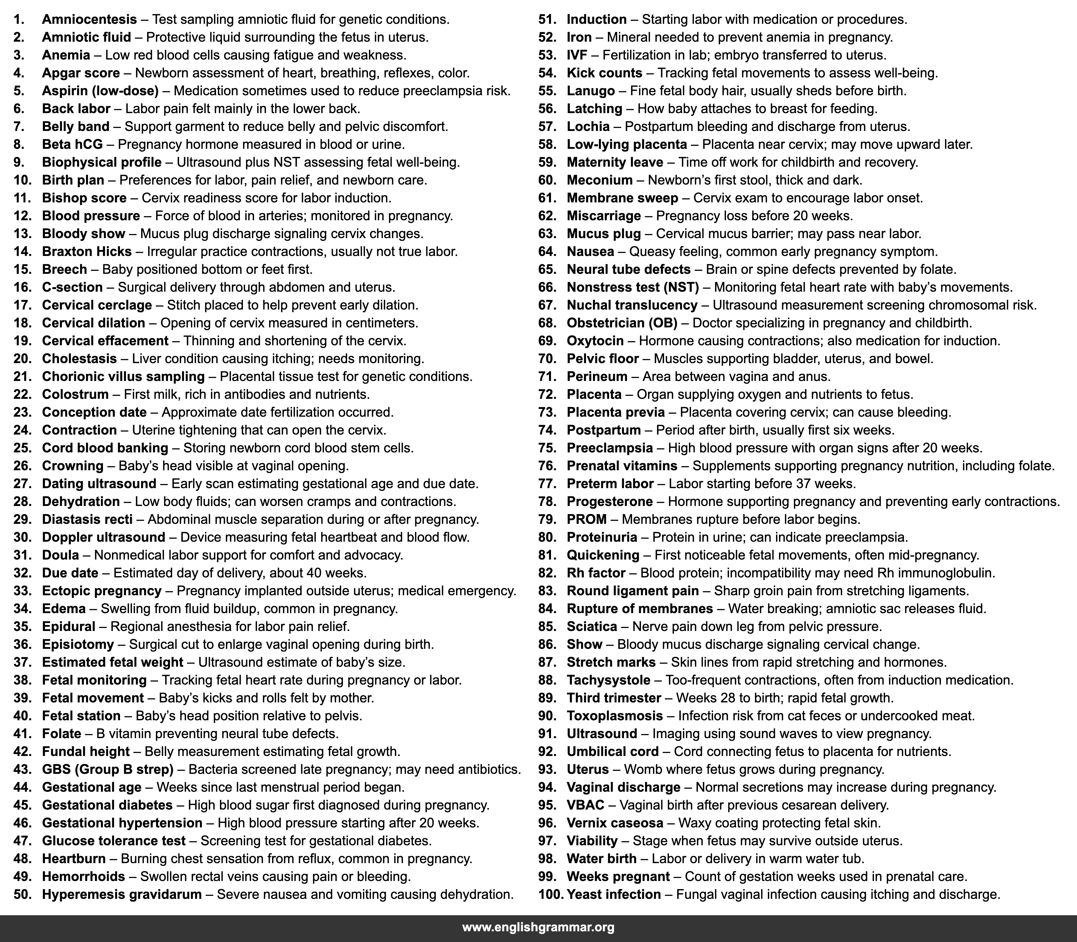| 31. | Doula | Nonmedical labor support for comfort and advocacy. |