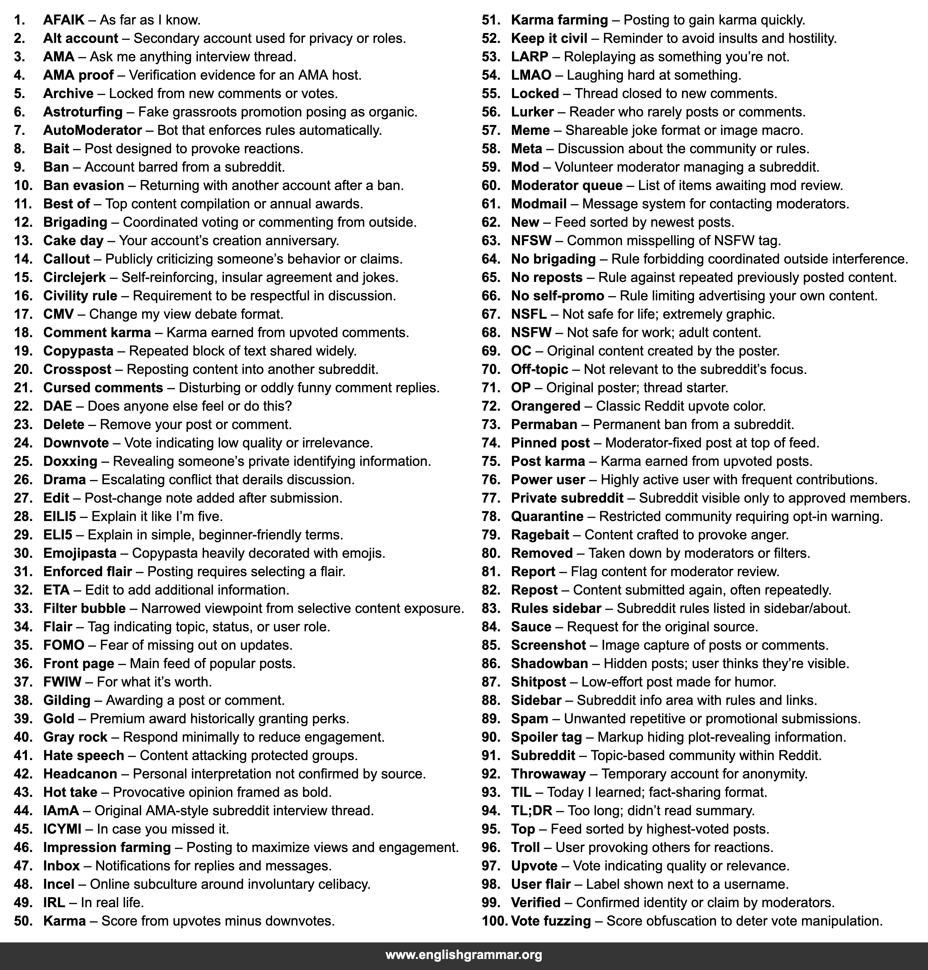 | 51. | Karma farming | Posting to gain karma quickly. |