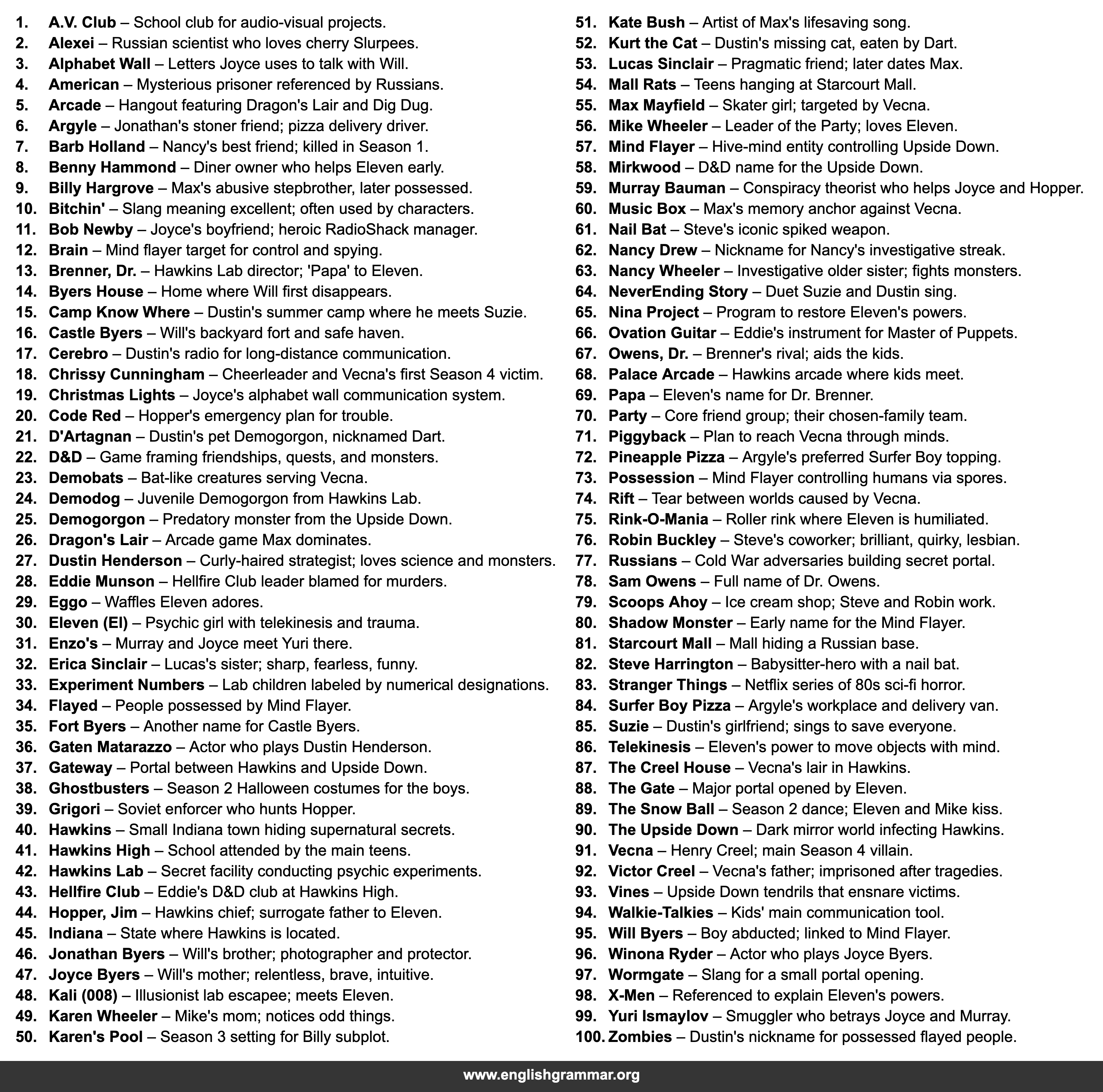 | 100. | Zombies | Dustin’s nickname for possessed flayed people. |
