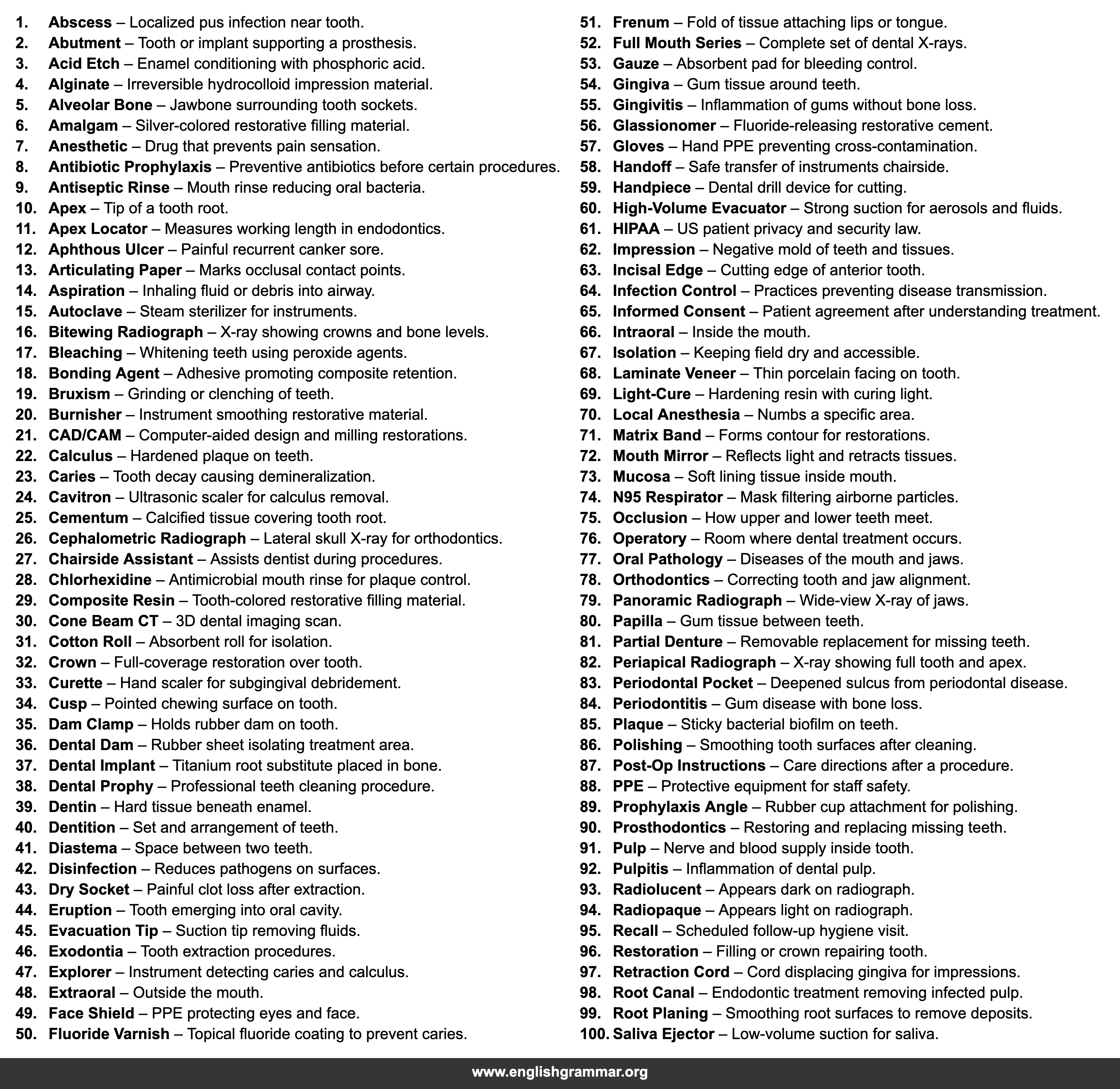 | 68. | Laminate Veneer | Thin porcelain facing on tooth. |