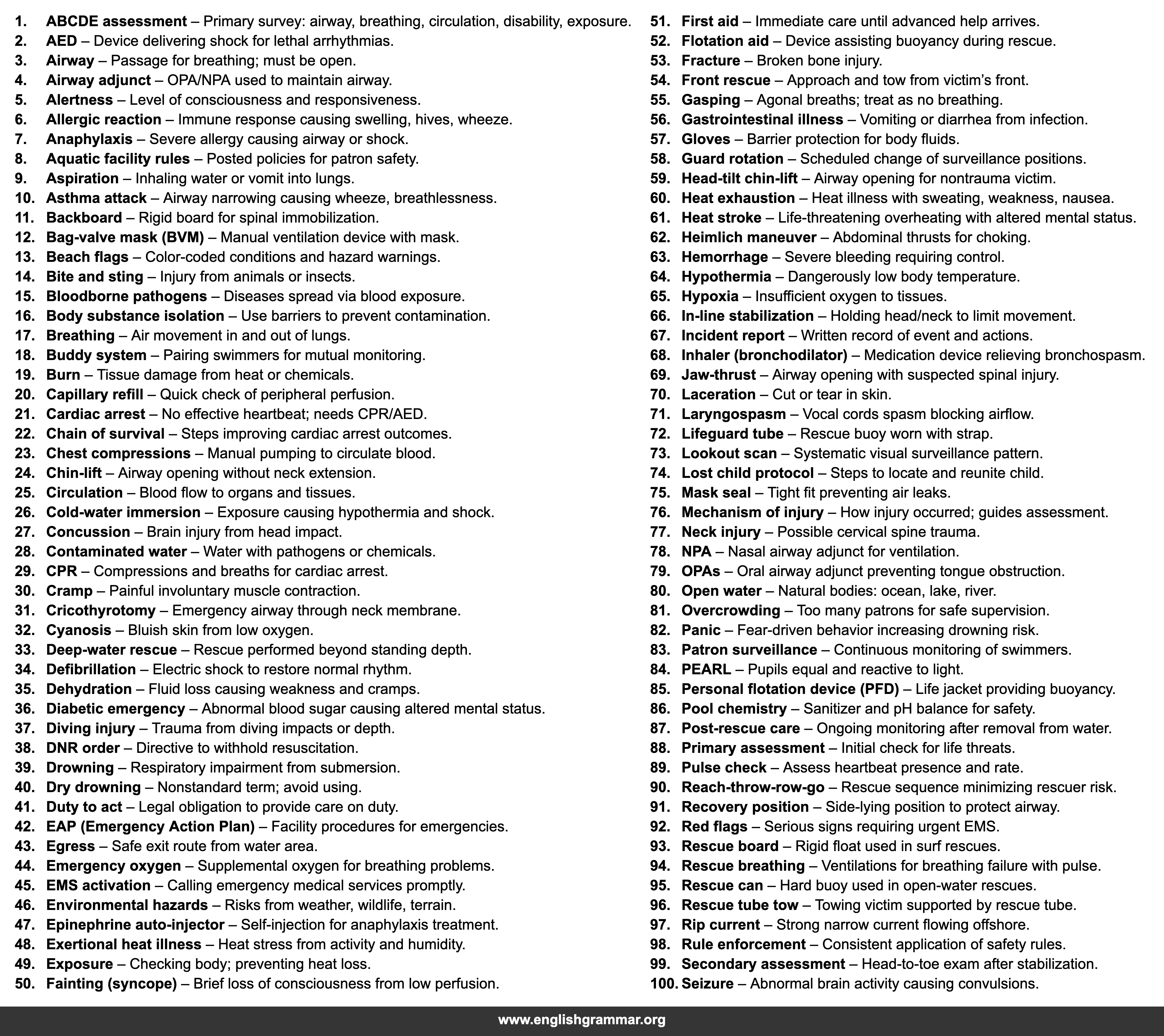 | 29. | CPR | Compressions and breaths for cardiac arrest. |
