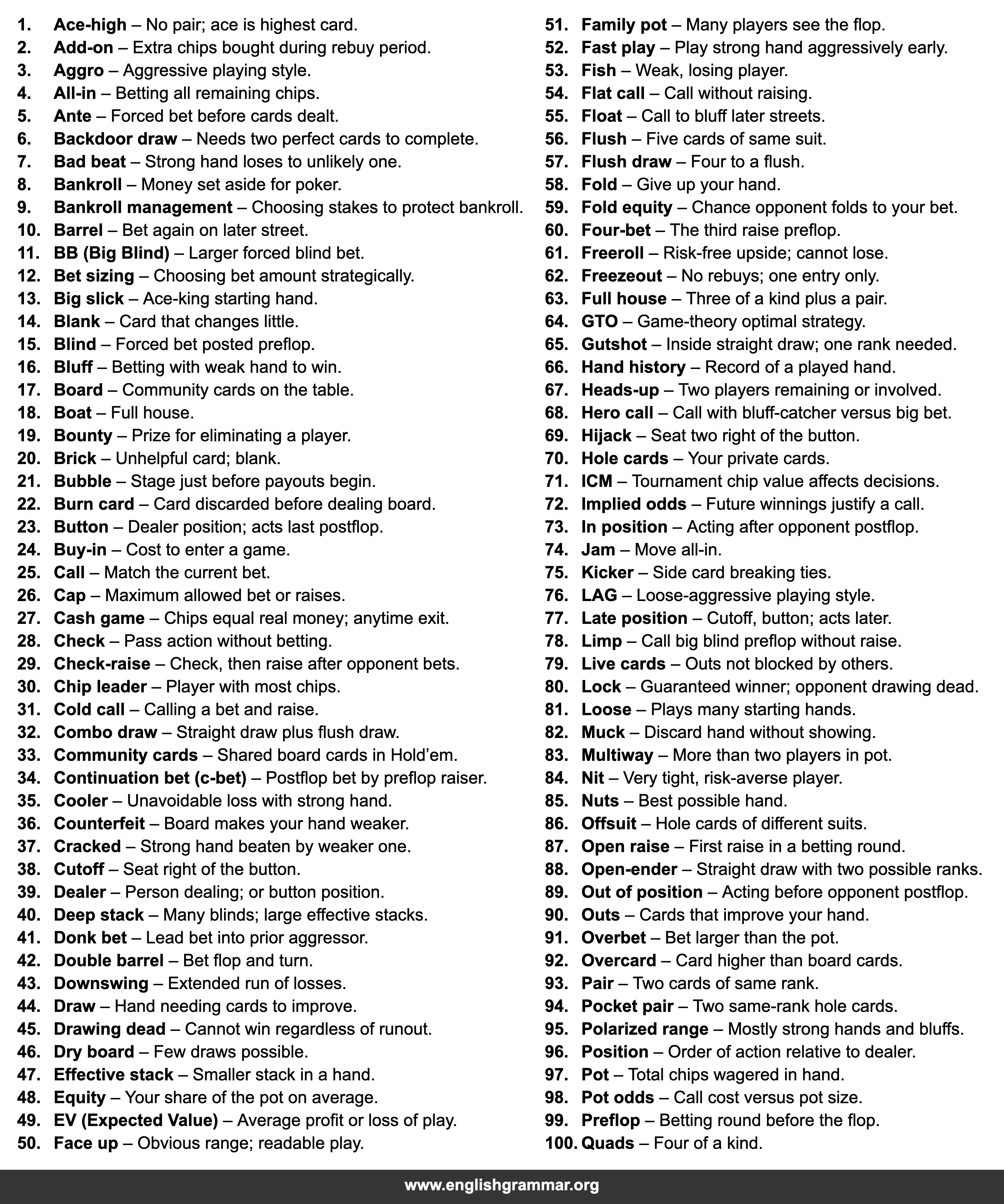 | 7. | Bad beat | Strong hand loses to unlikely one. |