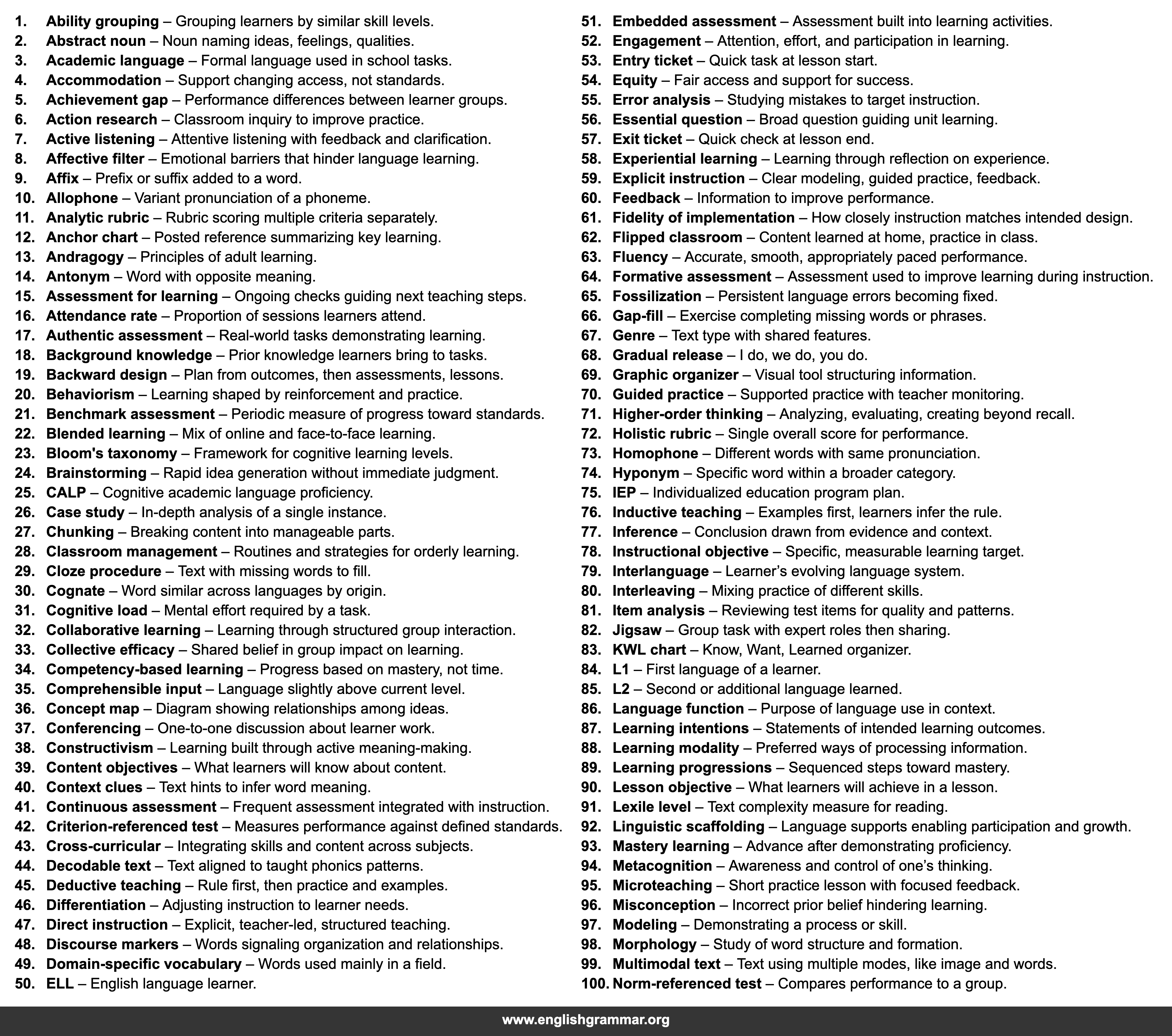 | 100. | Norm-referenced test | Compares performance to a group. |